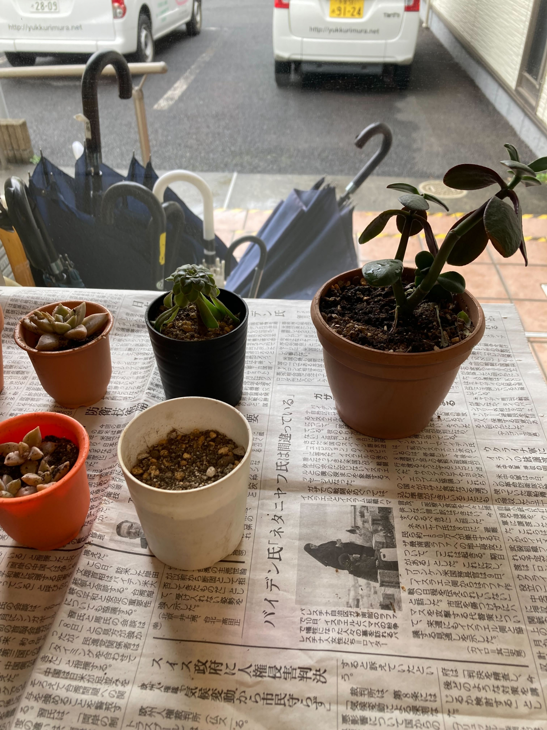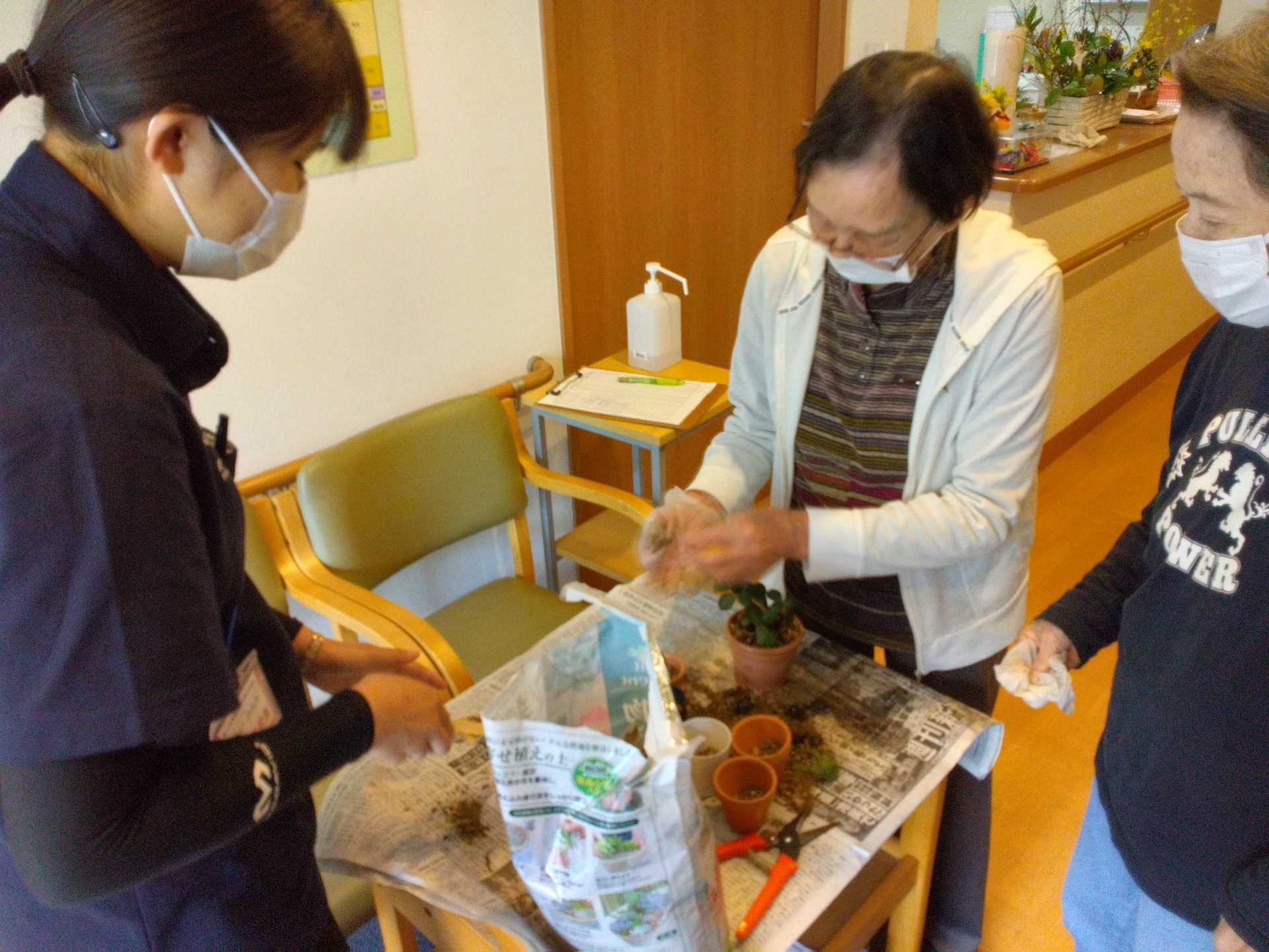 今日は、鉢植えの植え替えを行いました。小雨であったため、玄関での活動となりましたが、利用者様ともコミュニケーションをとりながら楽しく活動することができました。次回は天気の良い日に行えたら、より良いと感じました。