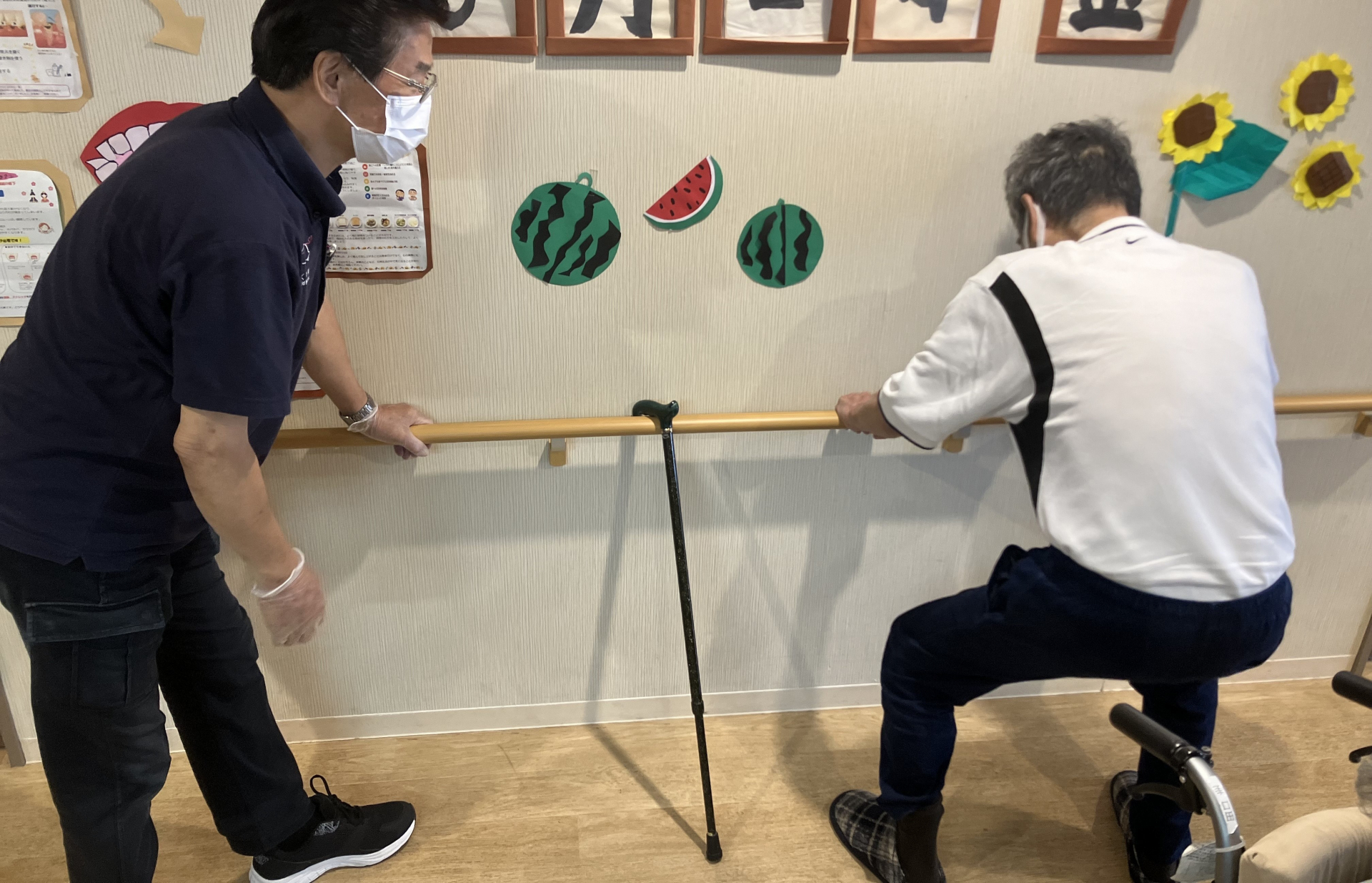 H職員がお声掛けし、一緒にお手本をお見せしながら