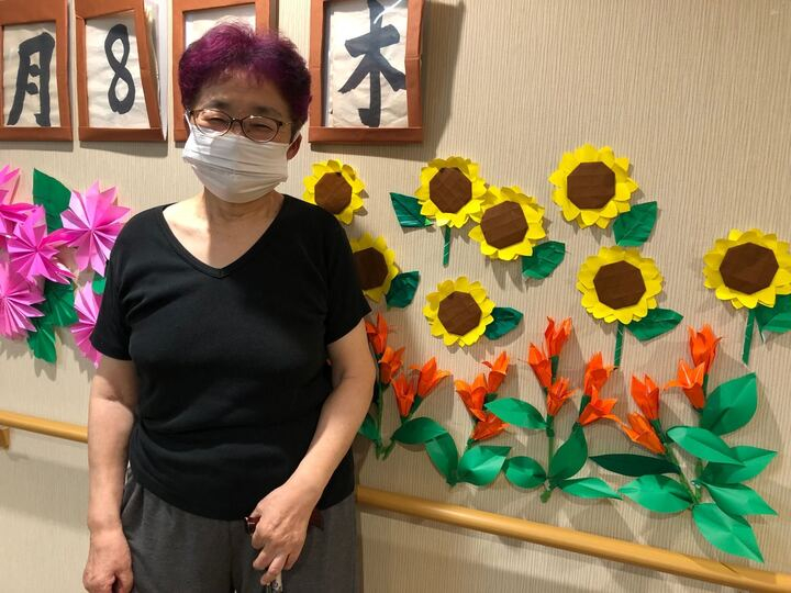 小規模フロア壁面のお花畑をバックに笑顔のW様 (#^^#)