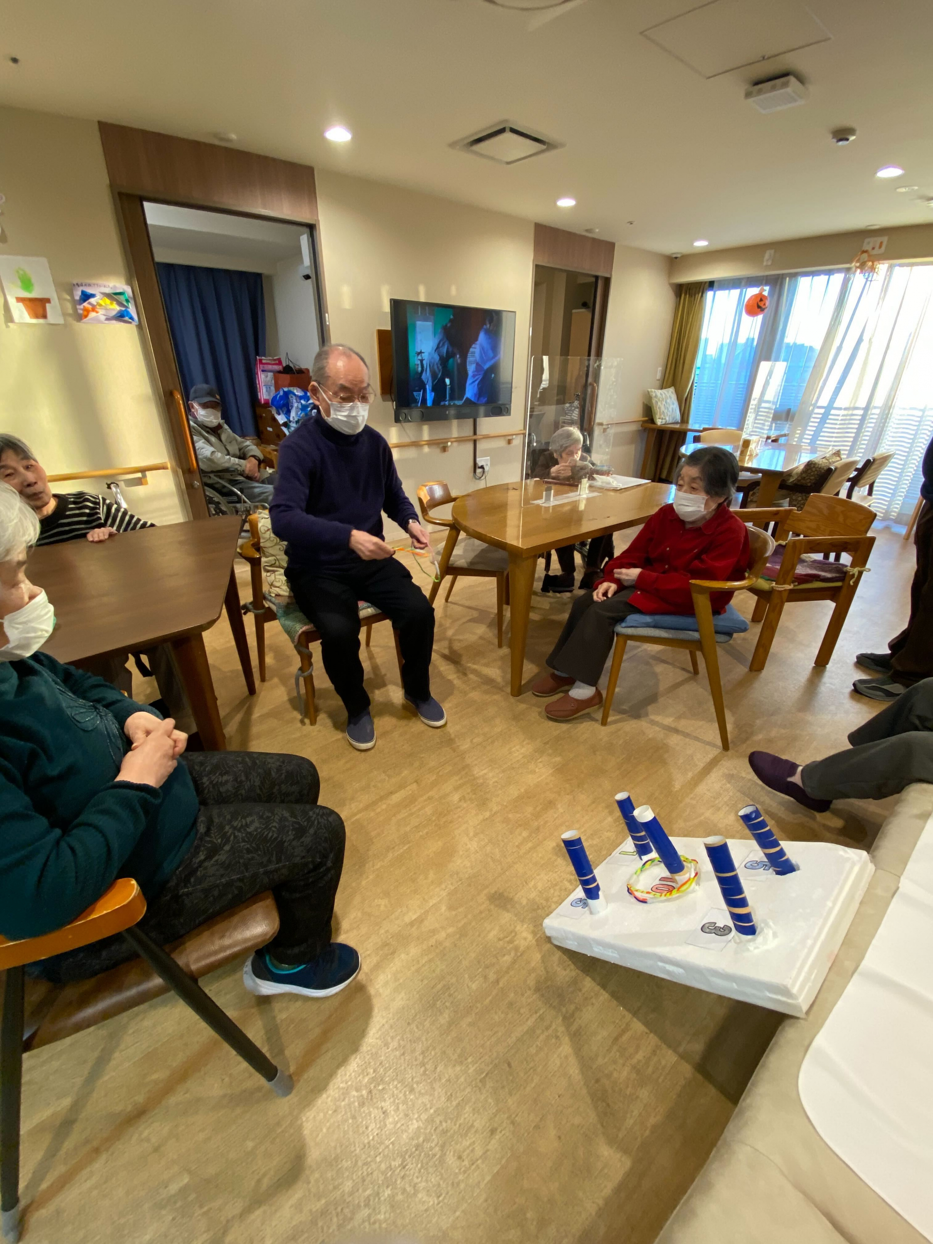 最近、天気の良い日が続いている為、外出レクリエーションが多くなりましたが、この日は室内で輪投げ大会となりました。(*^_^*)
