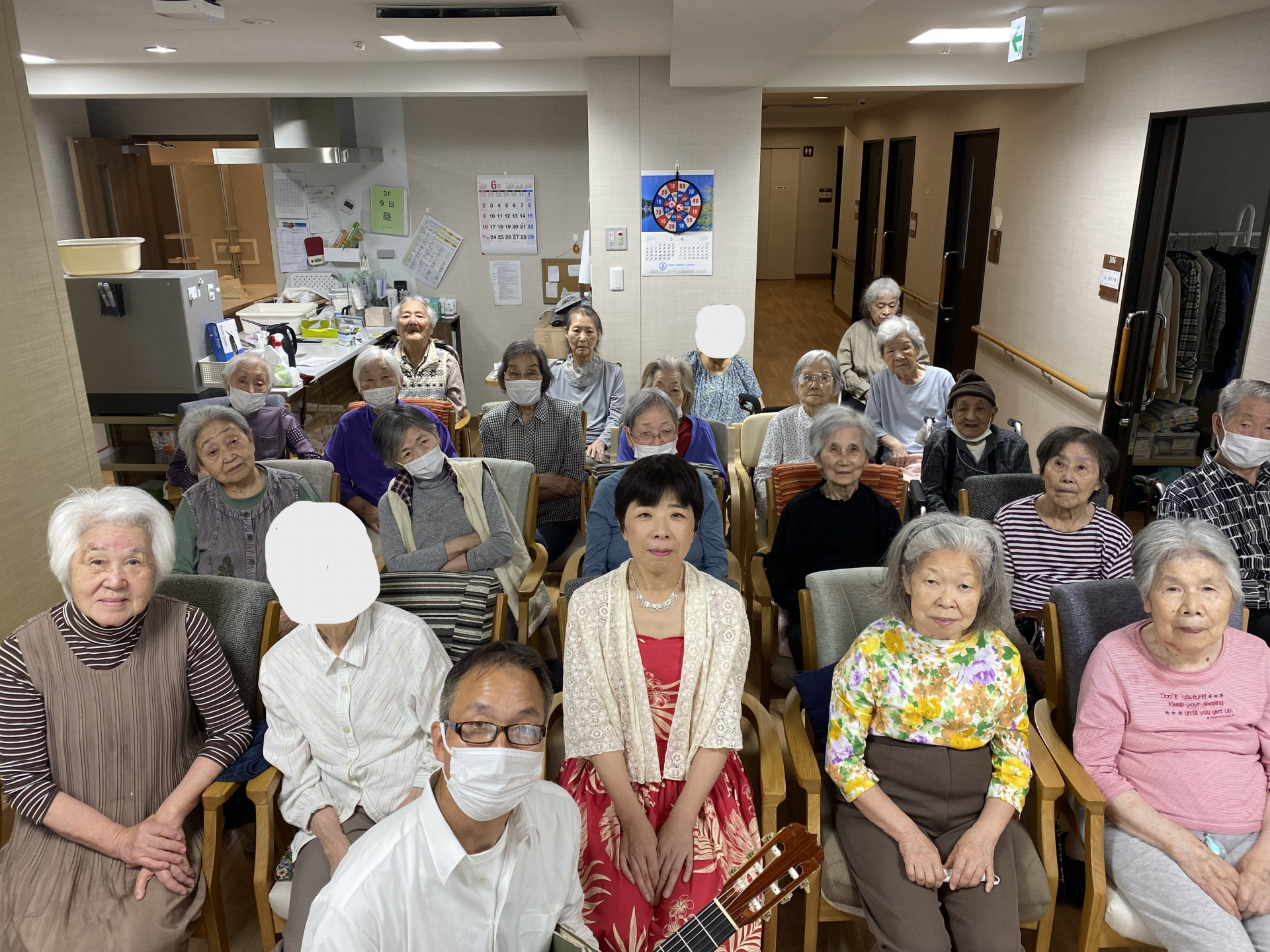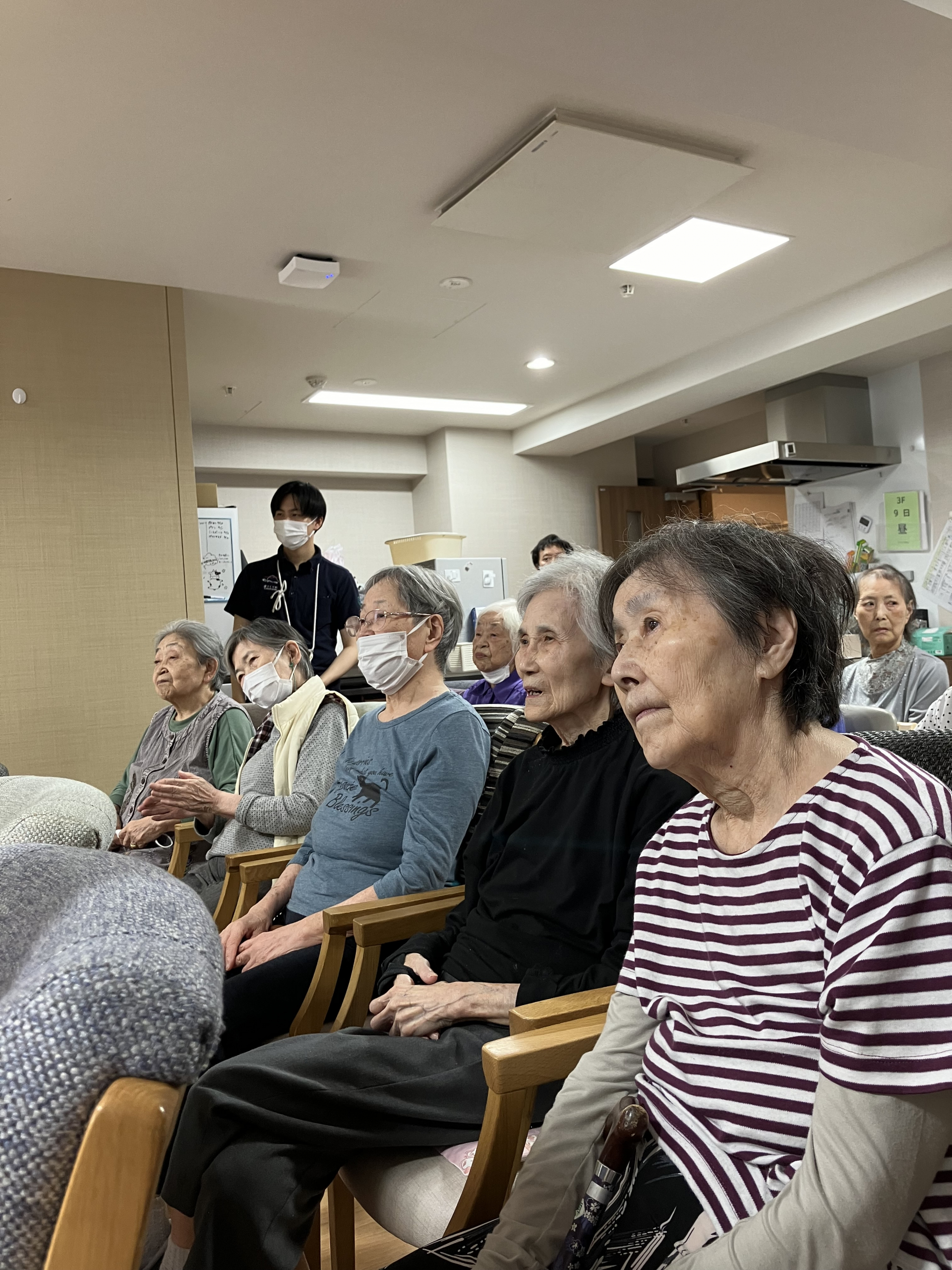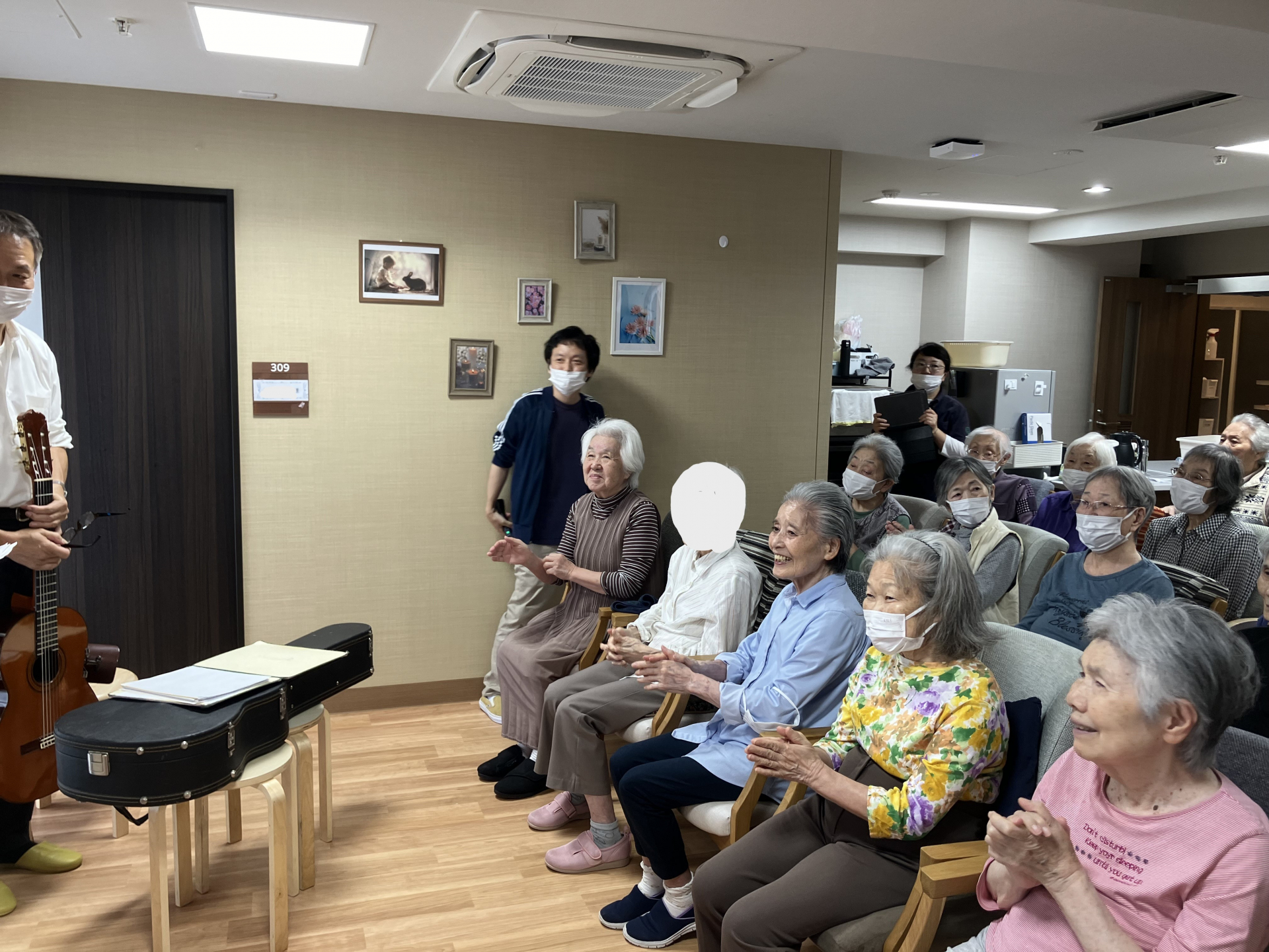 9日に音楽活動がありました。昔に流行した歌を披露してくださいました。3階の皆様のご様子を報告します。