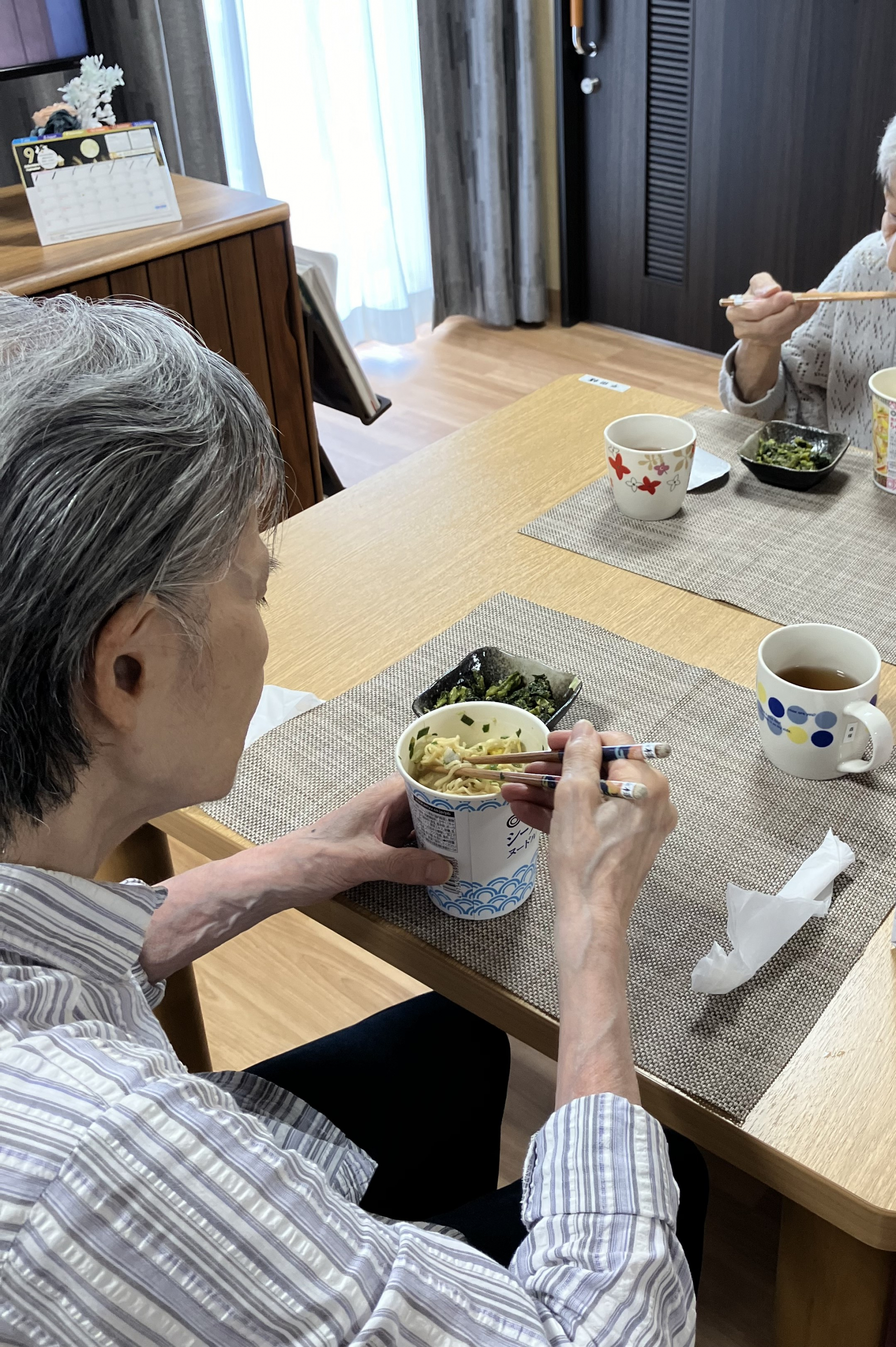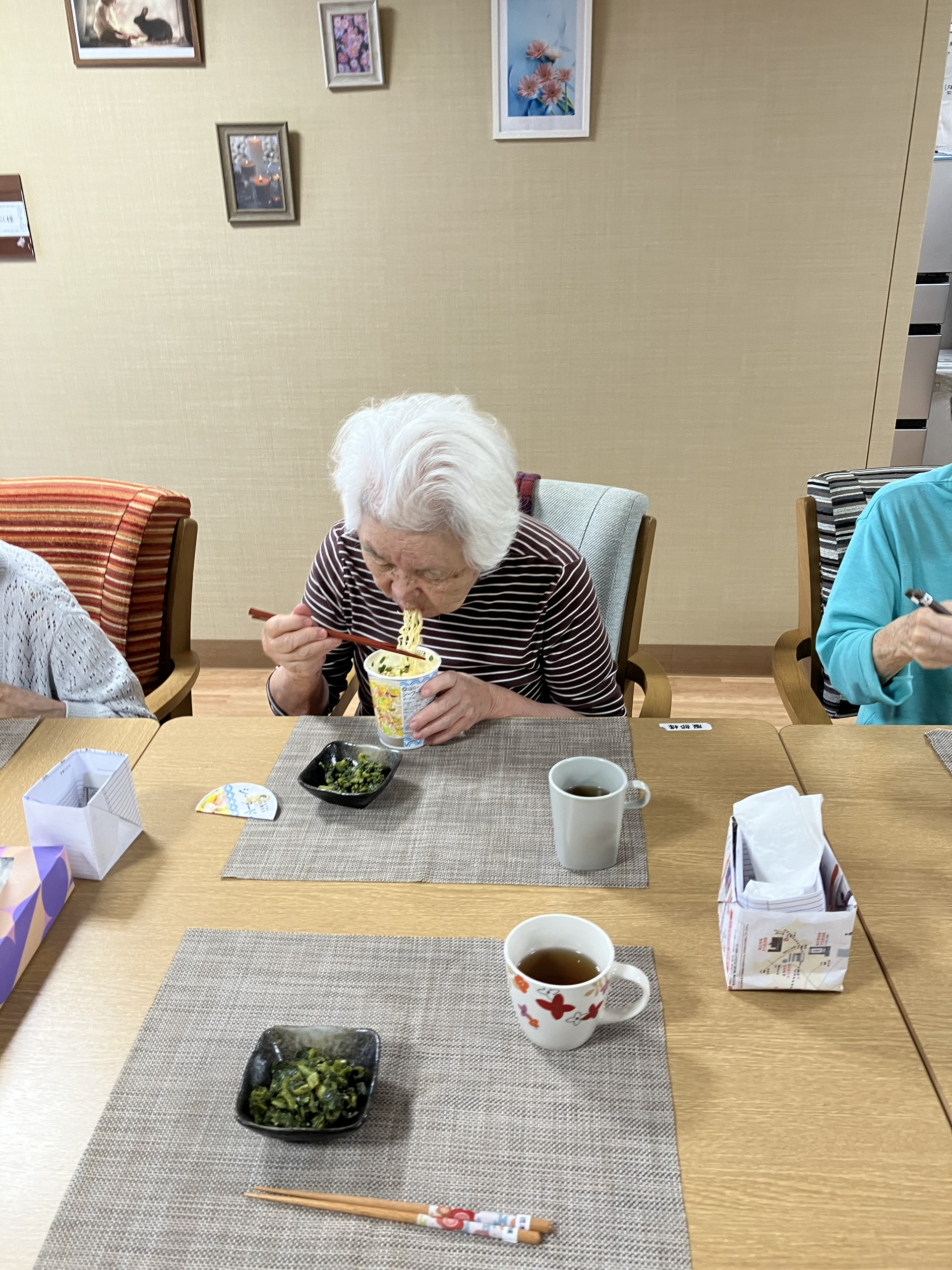昼食のご様子です。普段は栄養のバランスの良い食事を提供させていただいていますが、この日はカップラーメンを食べたいというリクエストがあったため、ラーメンとなりました。