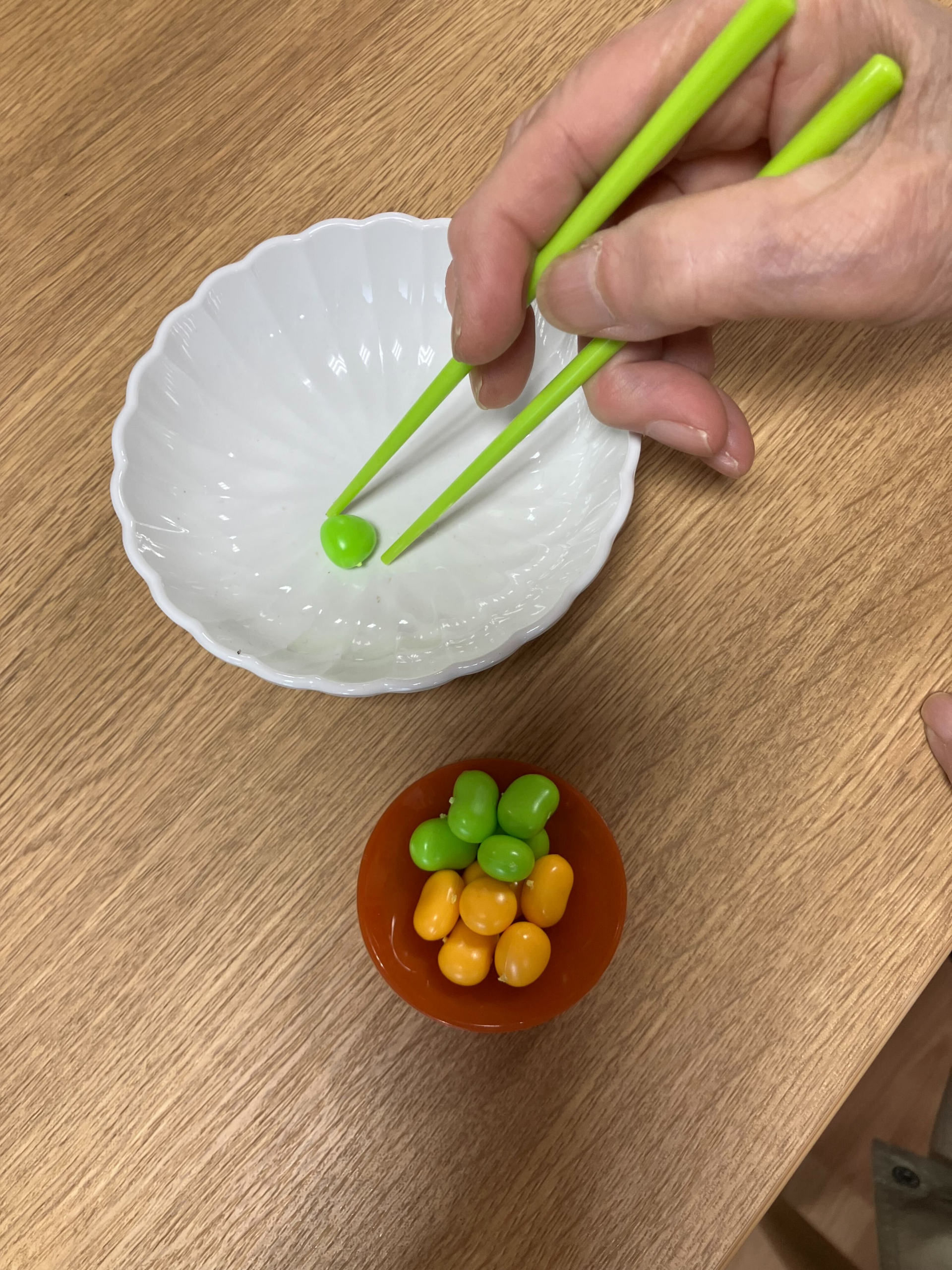黄色の豆より緑の豆をつかむのがた~いへん!