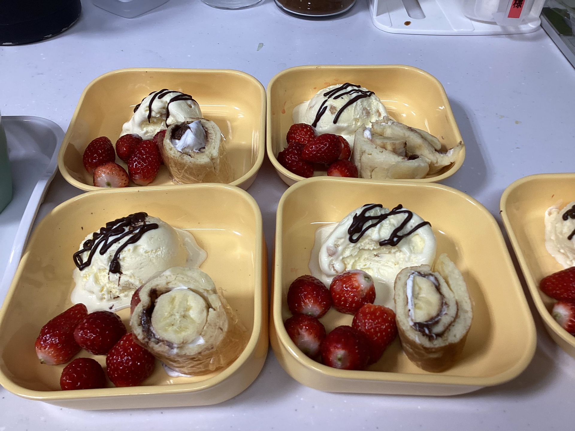 オムレットにアイス、いちごを添えてチョコソースでトッピング!