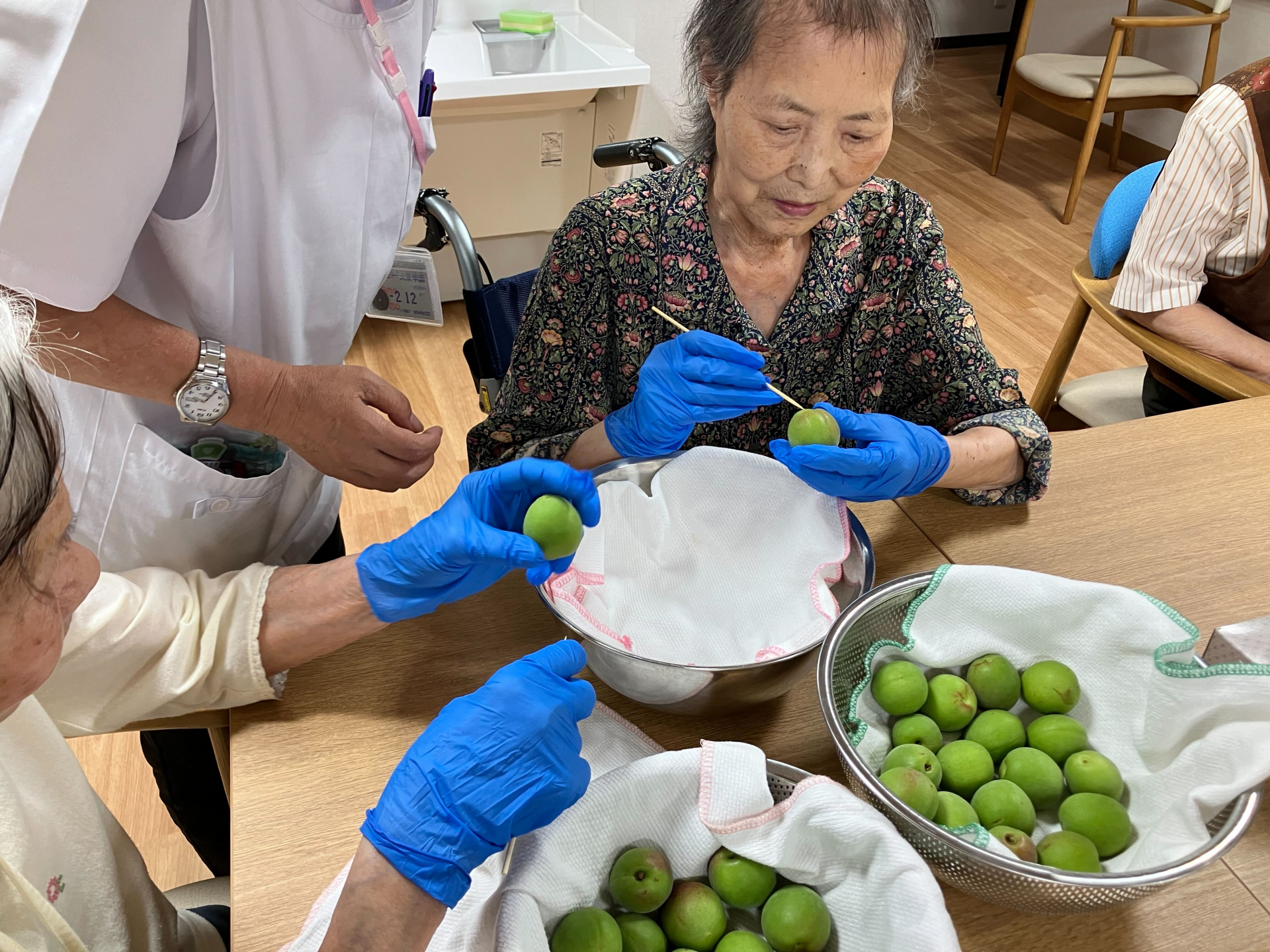 水気を切ったら丁寧丁寧に梅のヘタを竹串でとっていきます(^O^)