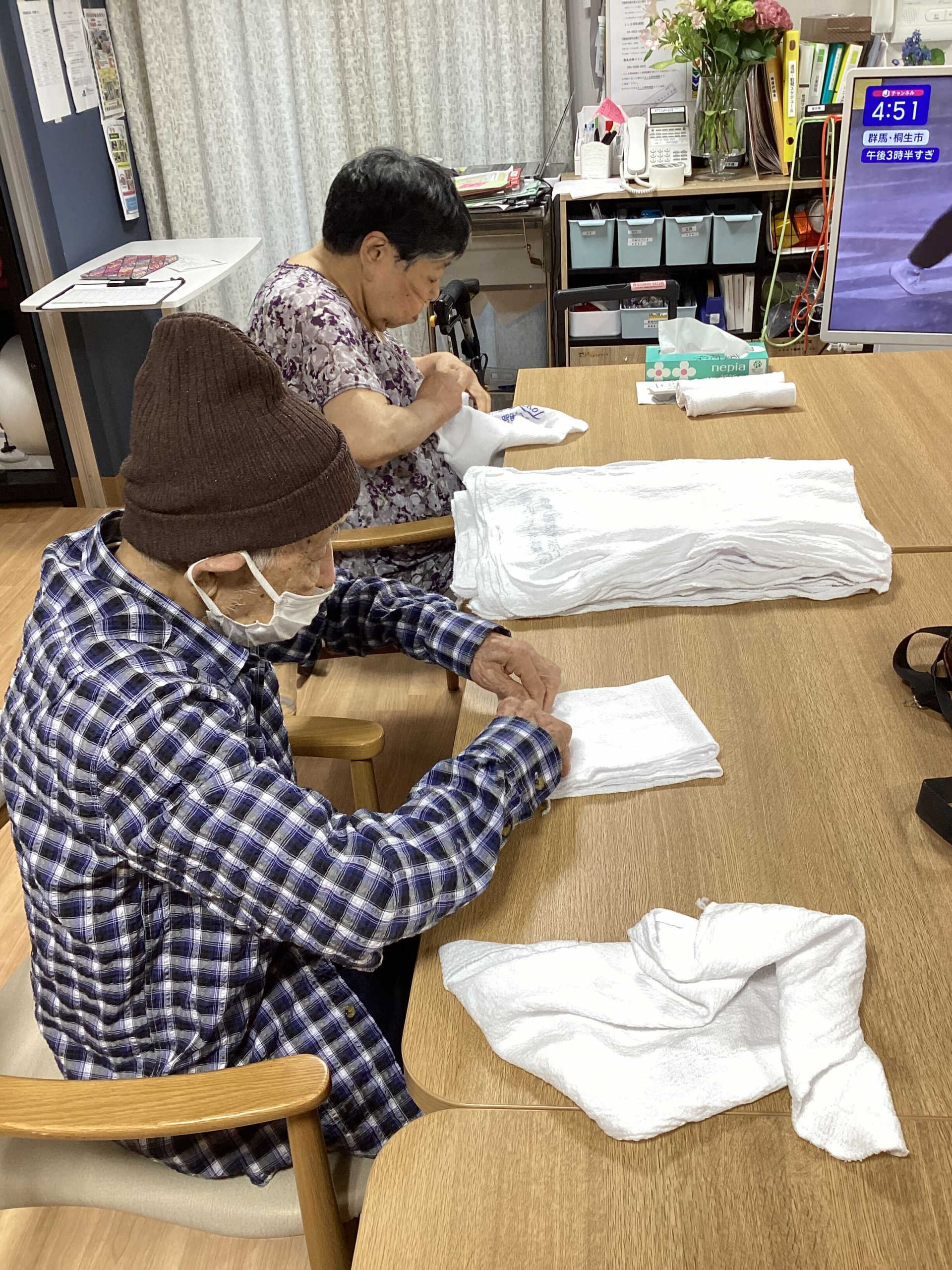 こちら側でE様とM様がタオルをたたんでからのクルクル巻き!