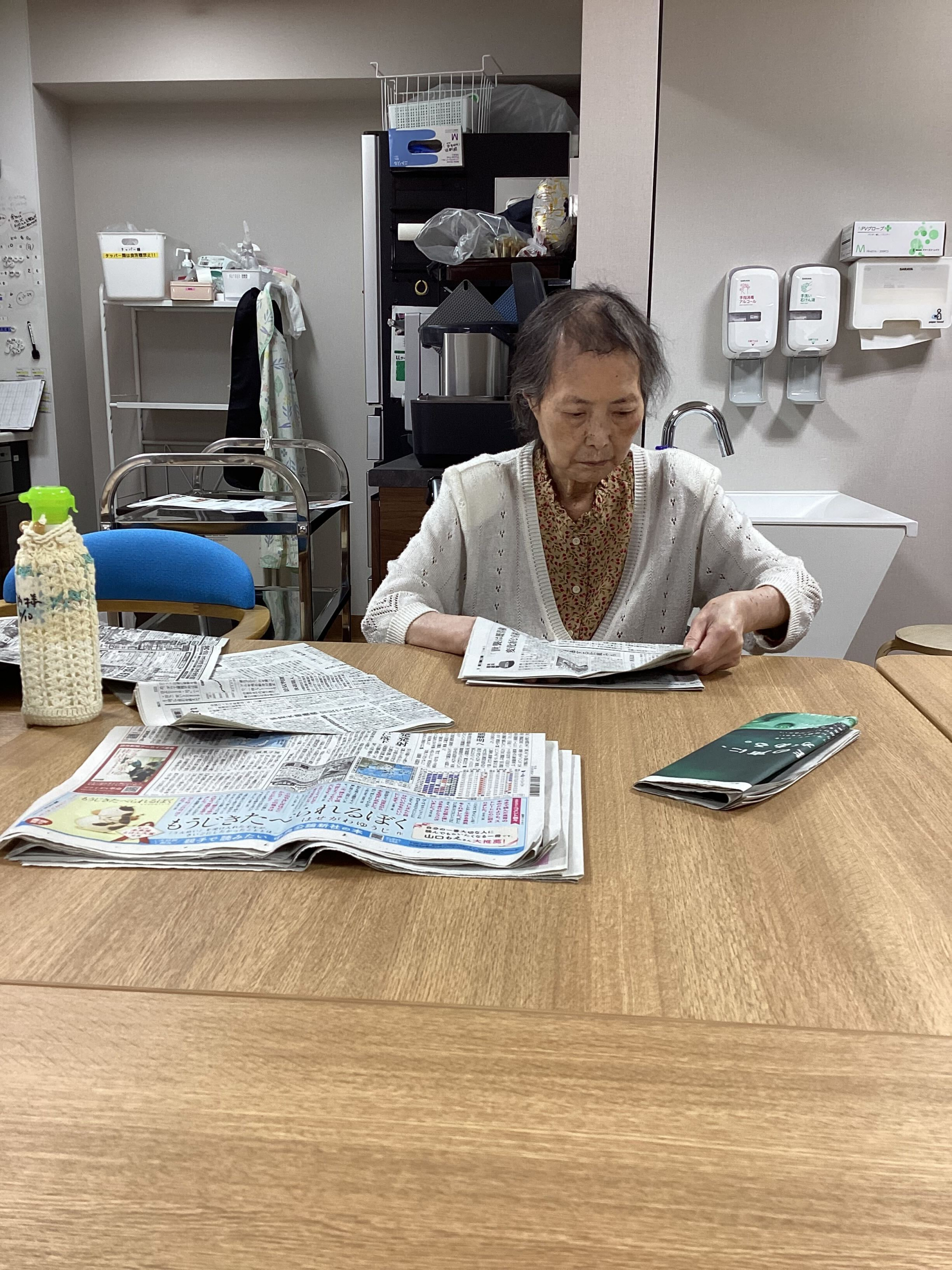 テーブルの反対側ではK様が新聞をたたんでくださいます!