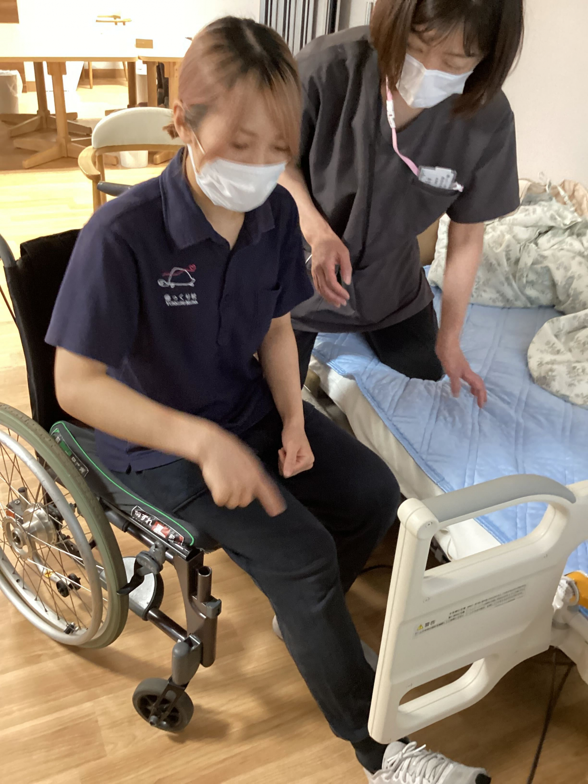 すぐさま岡田理学療法士が職員に介助の仕方を教えてくれます(^O^)