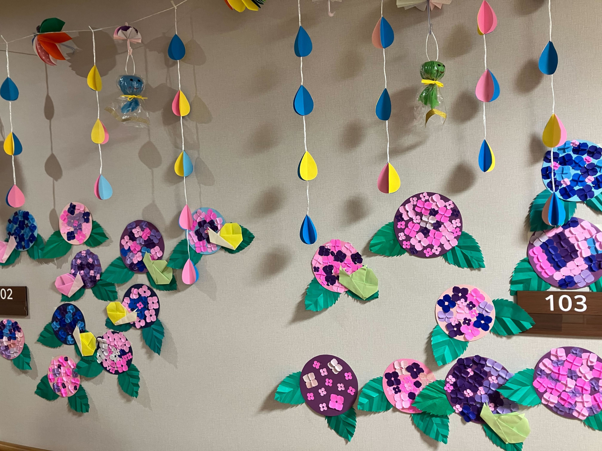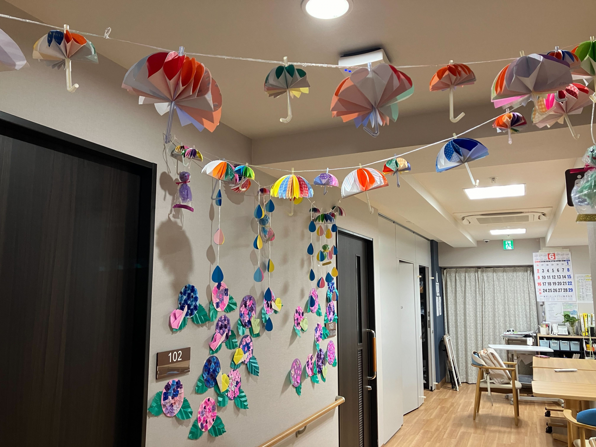 フロアの壁もあじさい満開、傘やテルテル坊主も登場です(^^♪