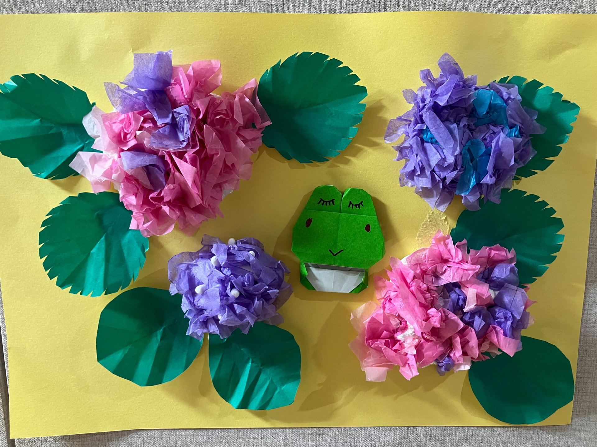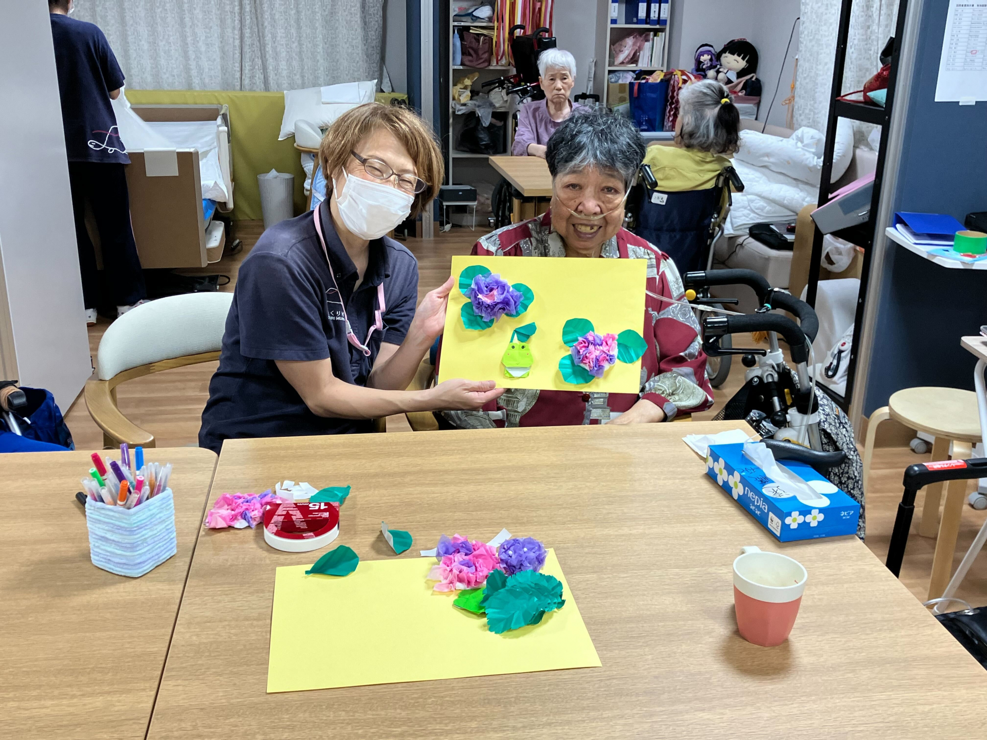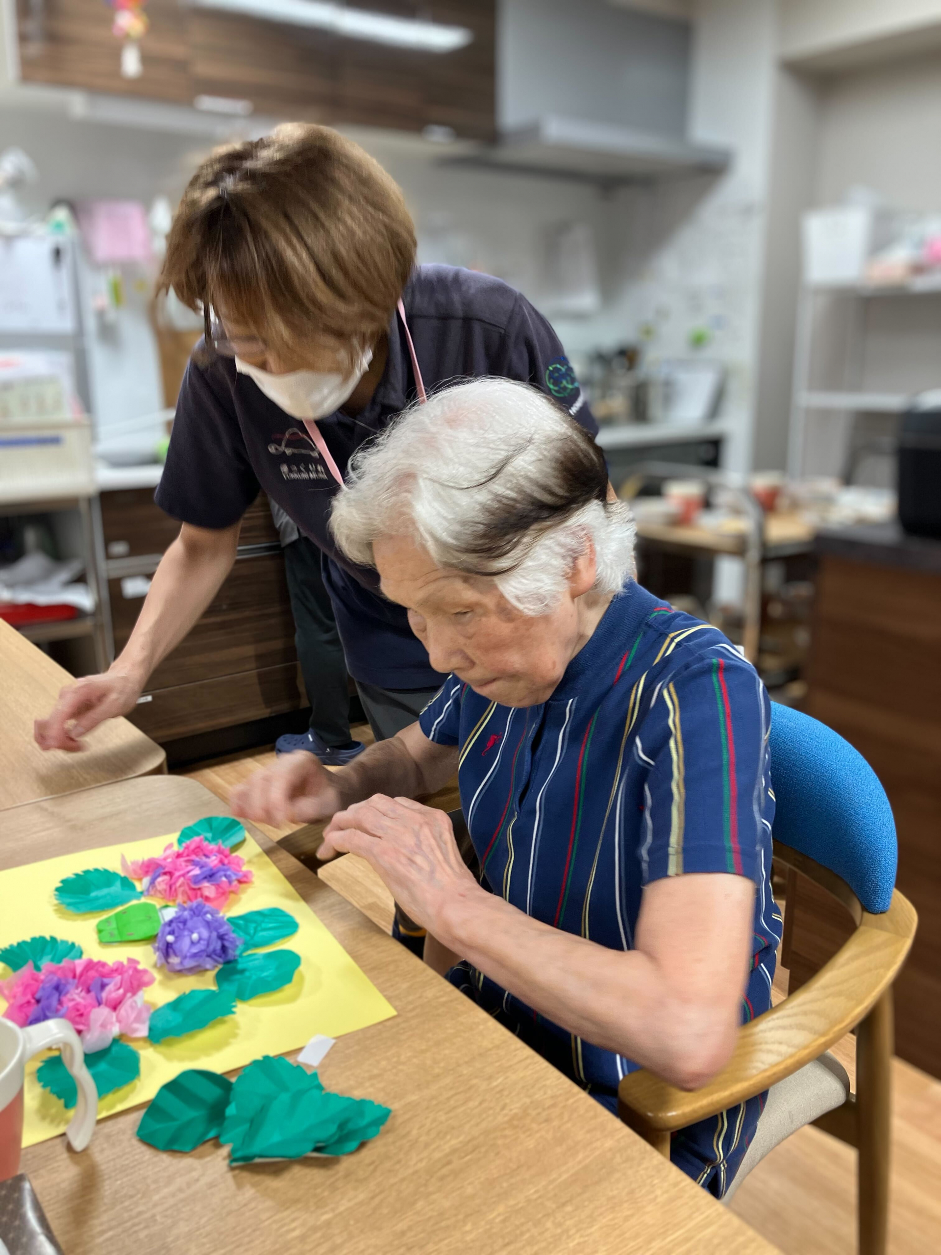 フロアではあじさいのモチーフを画用紙に貼り付けています(^O^)