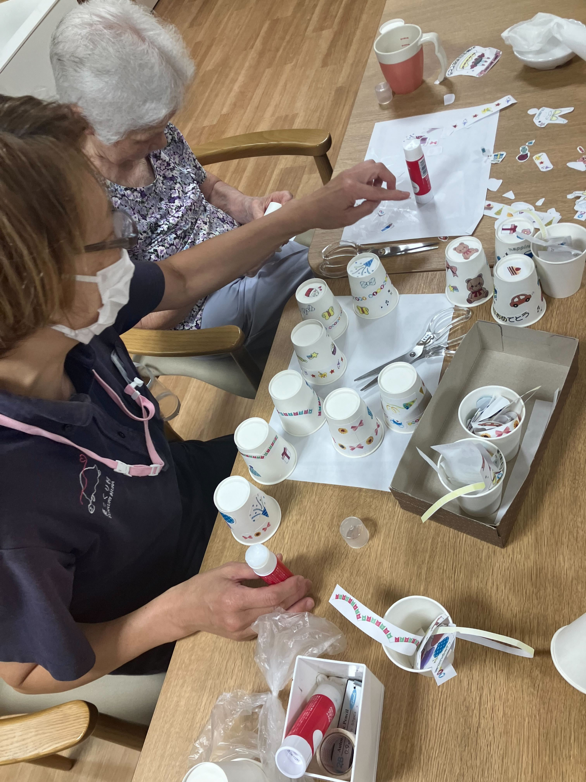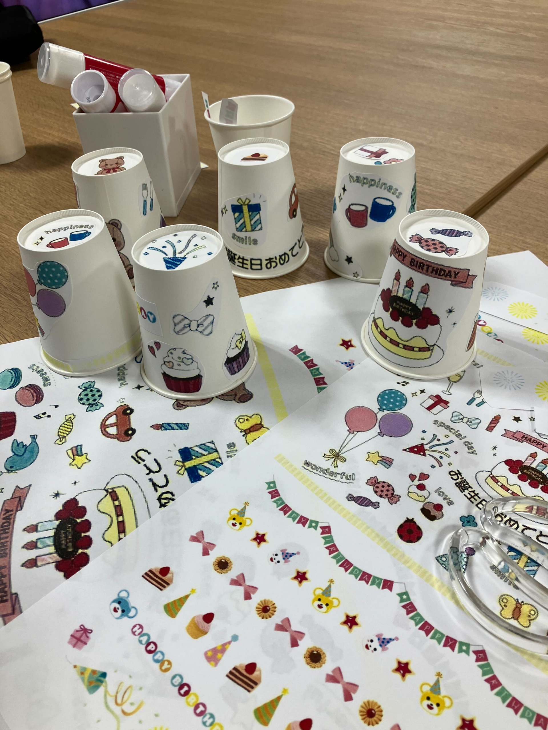 かわいいモチーフを貼った紙コップがたくさんできあがりました(^^)v