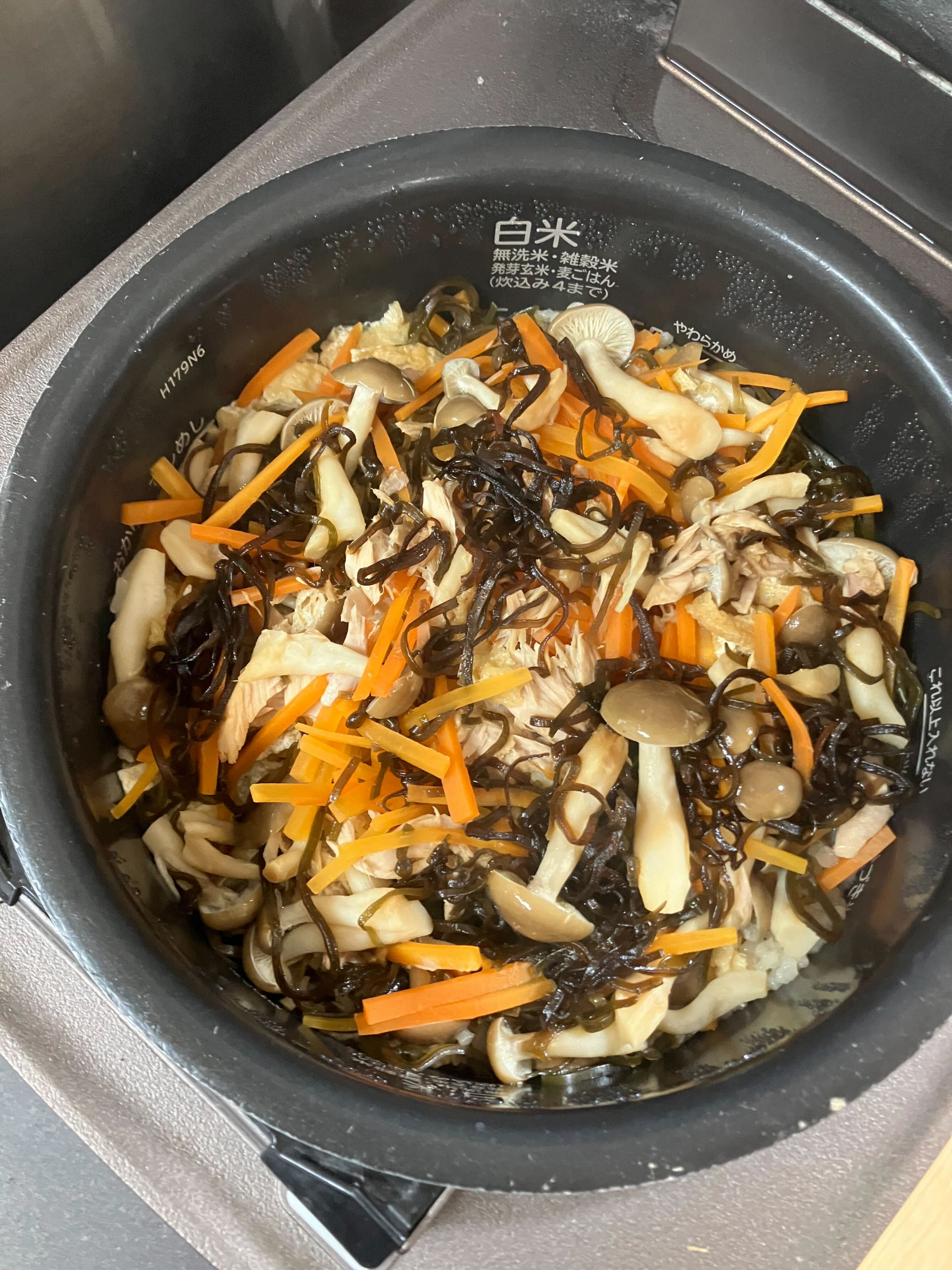 ニンジンやきのこ、塩昆布などを入れて炊き込みます(^O^)