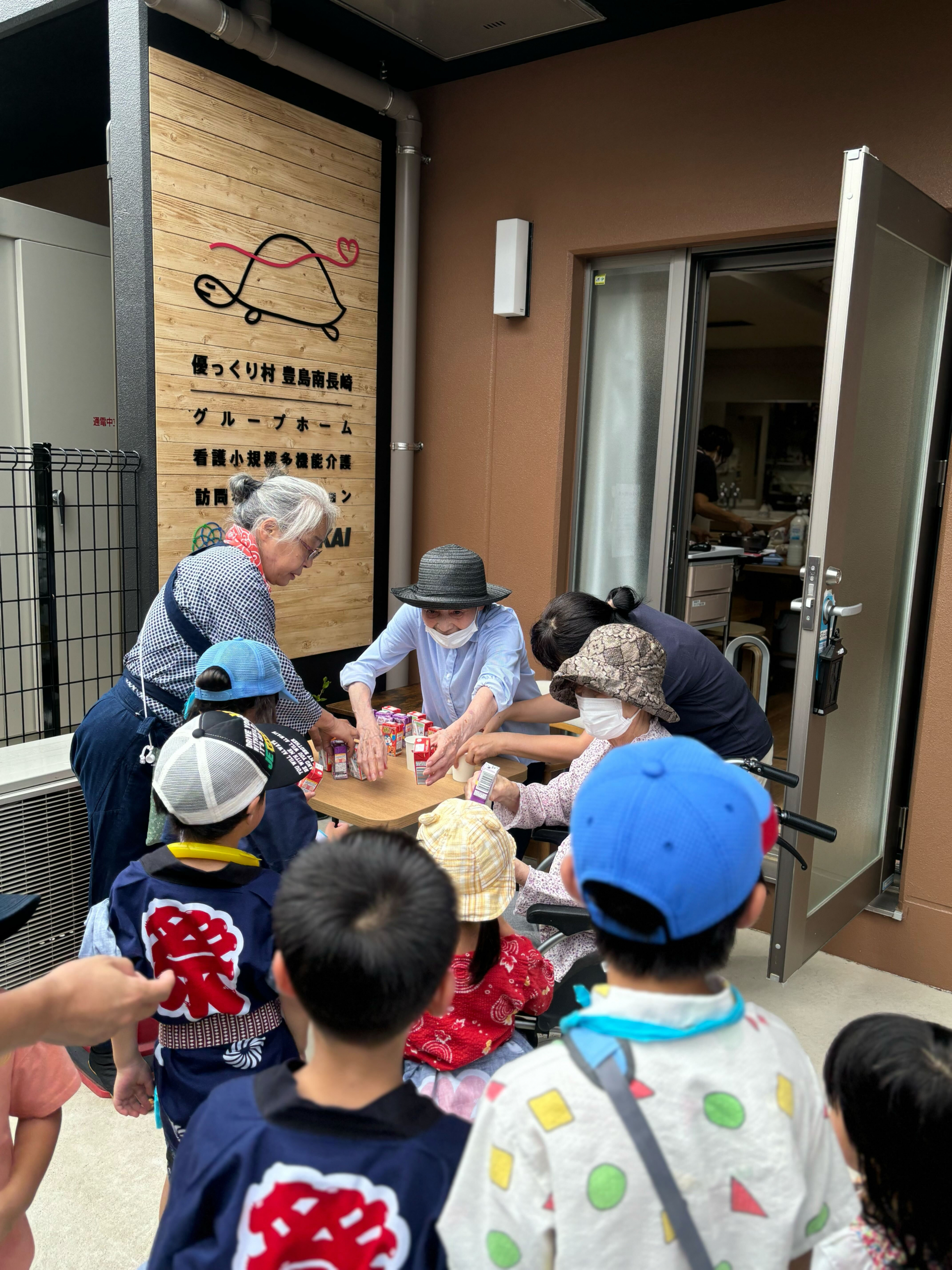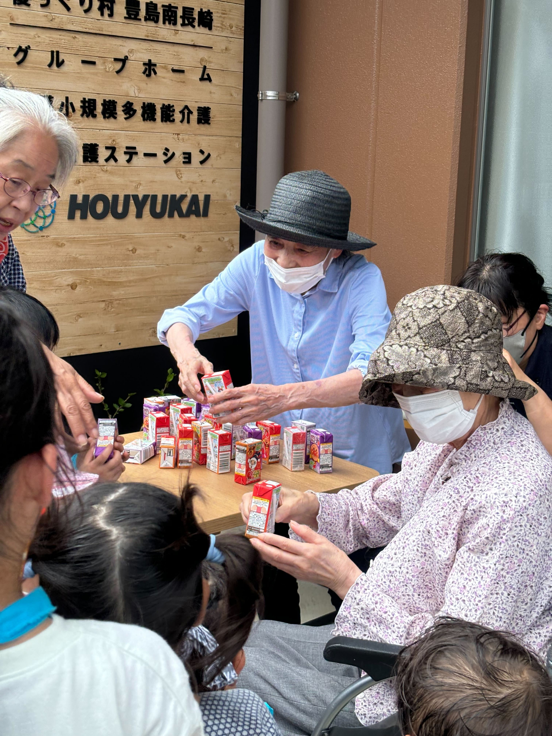 駐車場で子供たちにジュースを配らせていただいて
