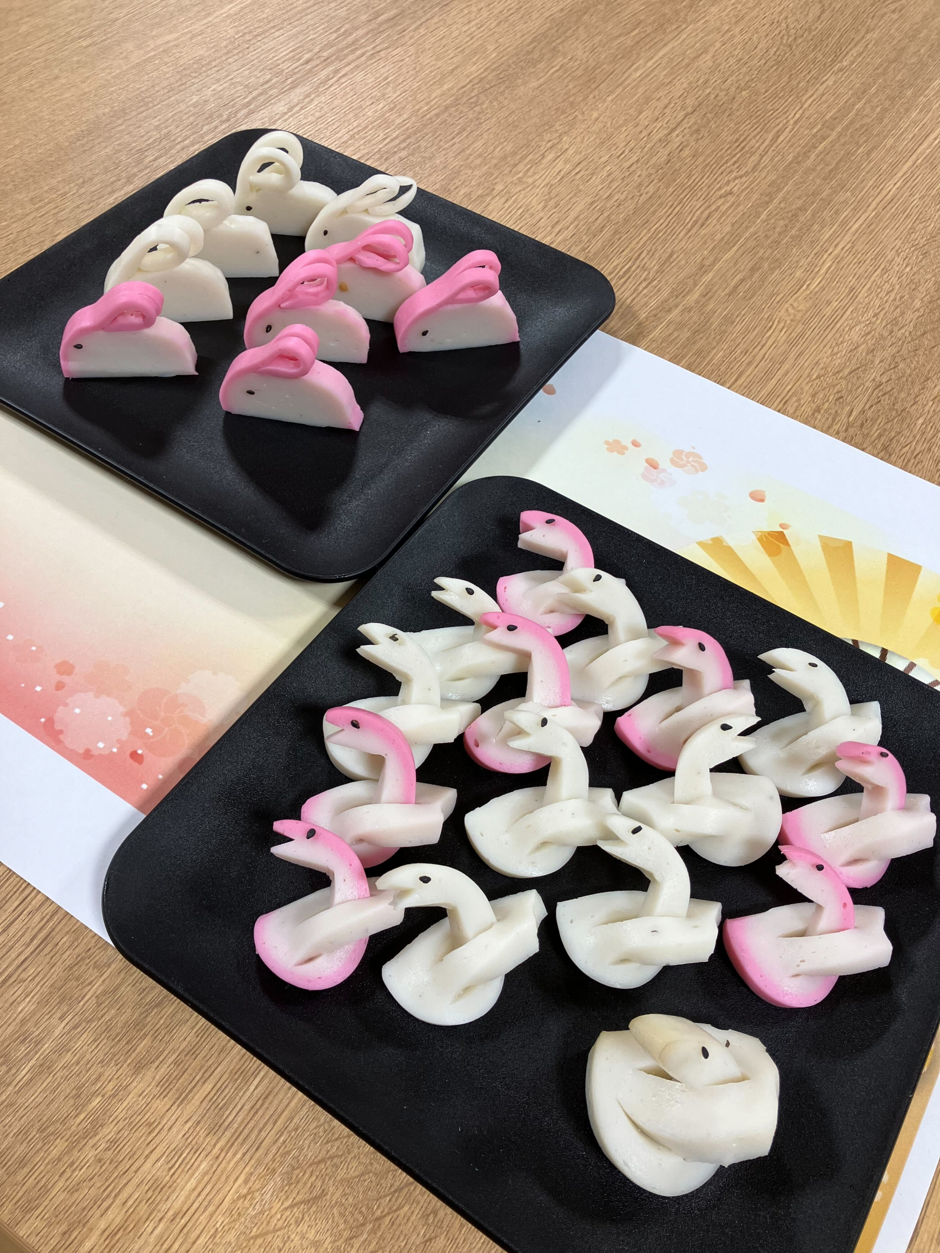 この蒲鉾は飾り切り、蛇君たちと雪うさぎちゃんたちです♡