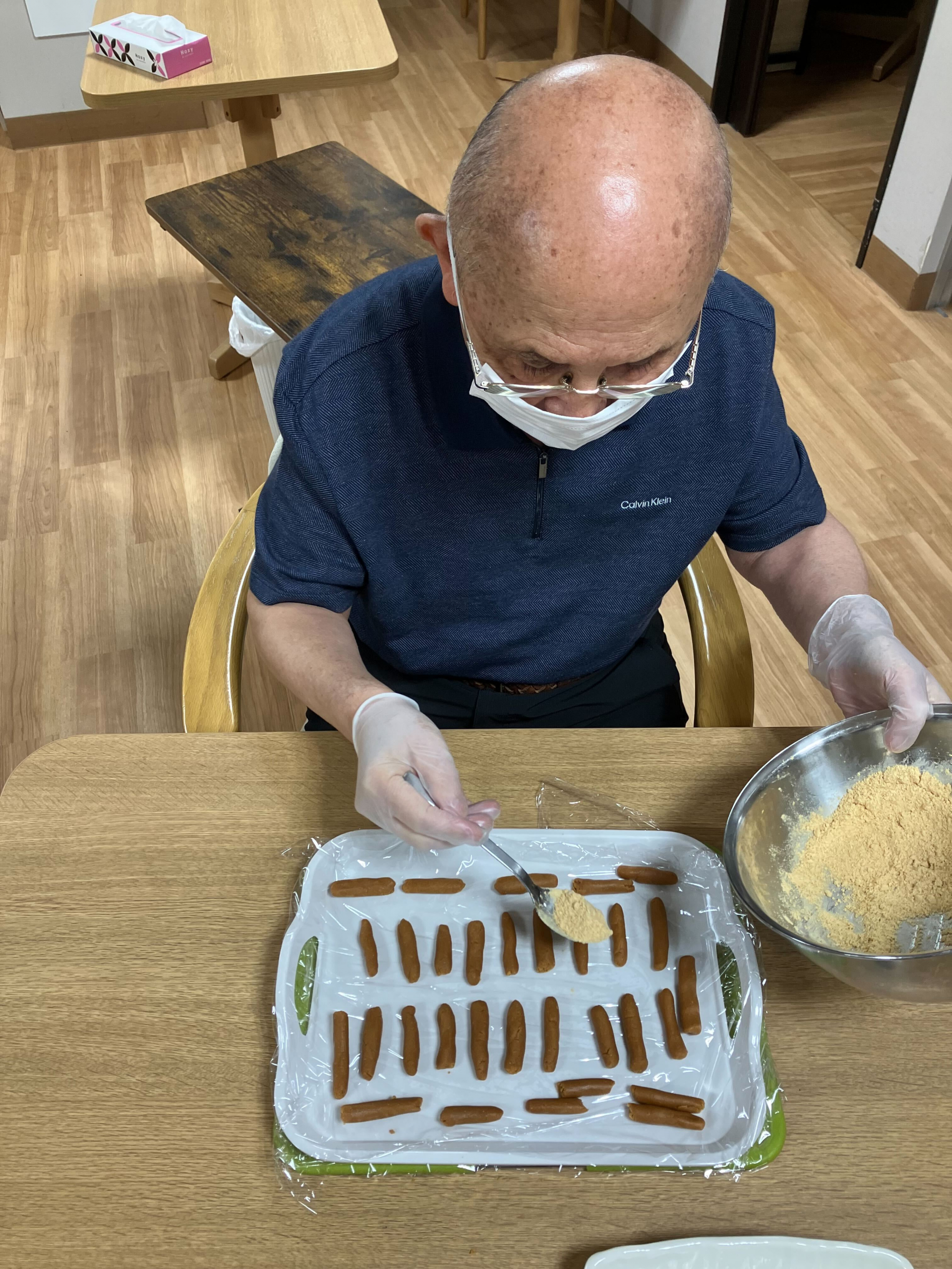 コロコロきな粉を棒に丸めて、カットしたらきな粉をさらにかけます(^^♪
