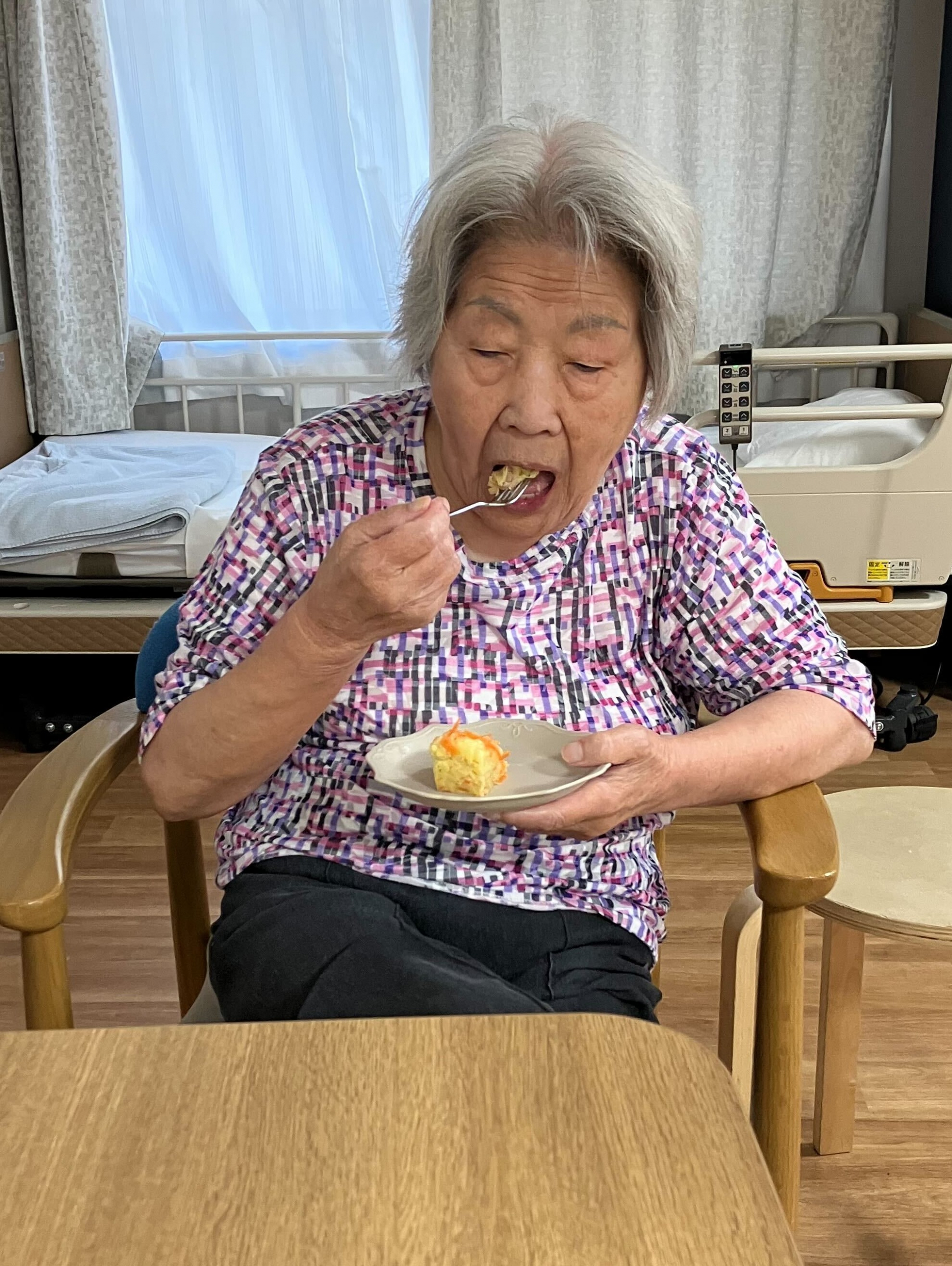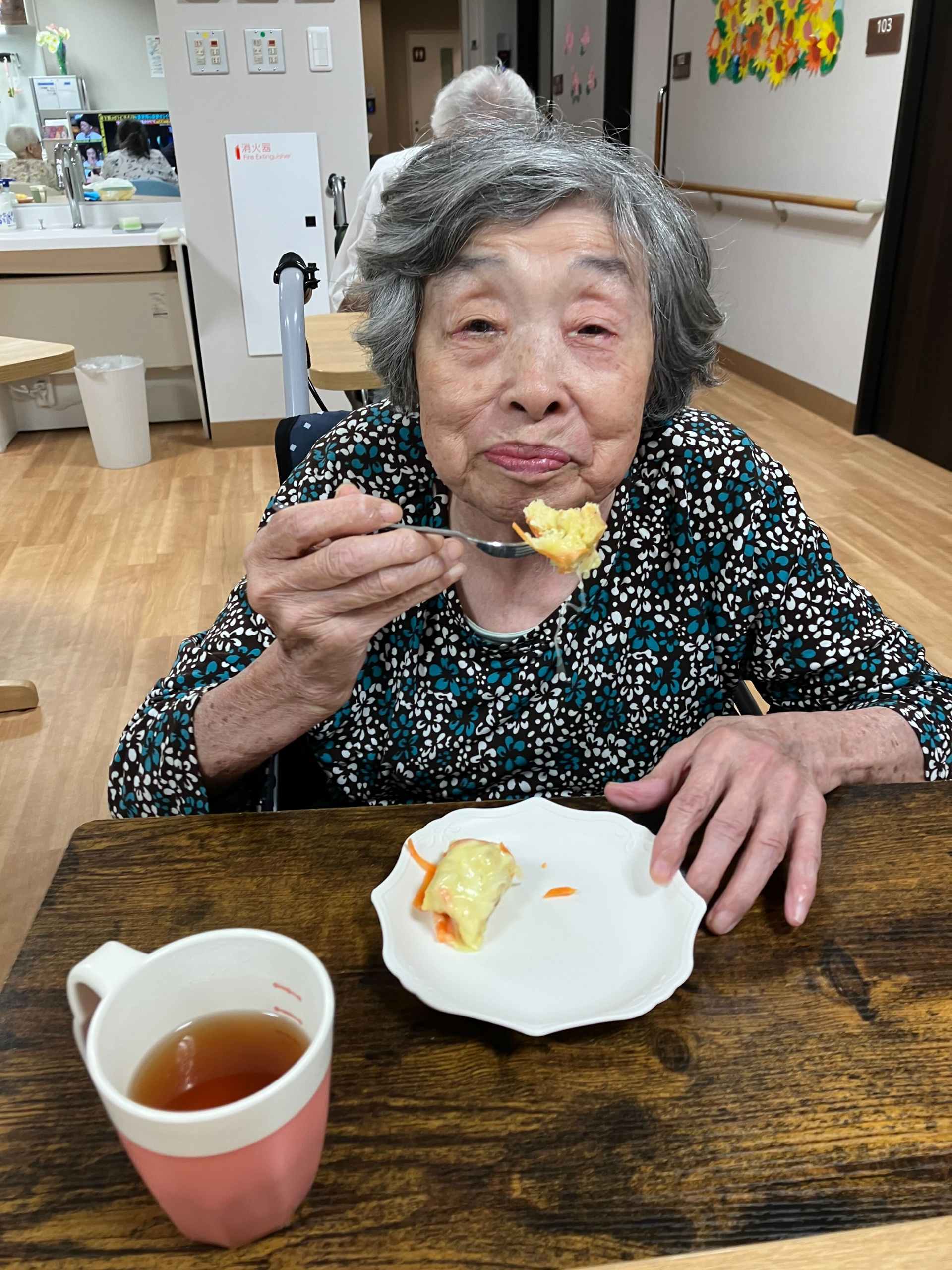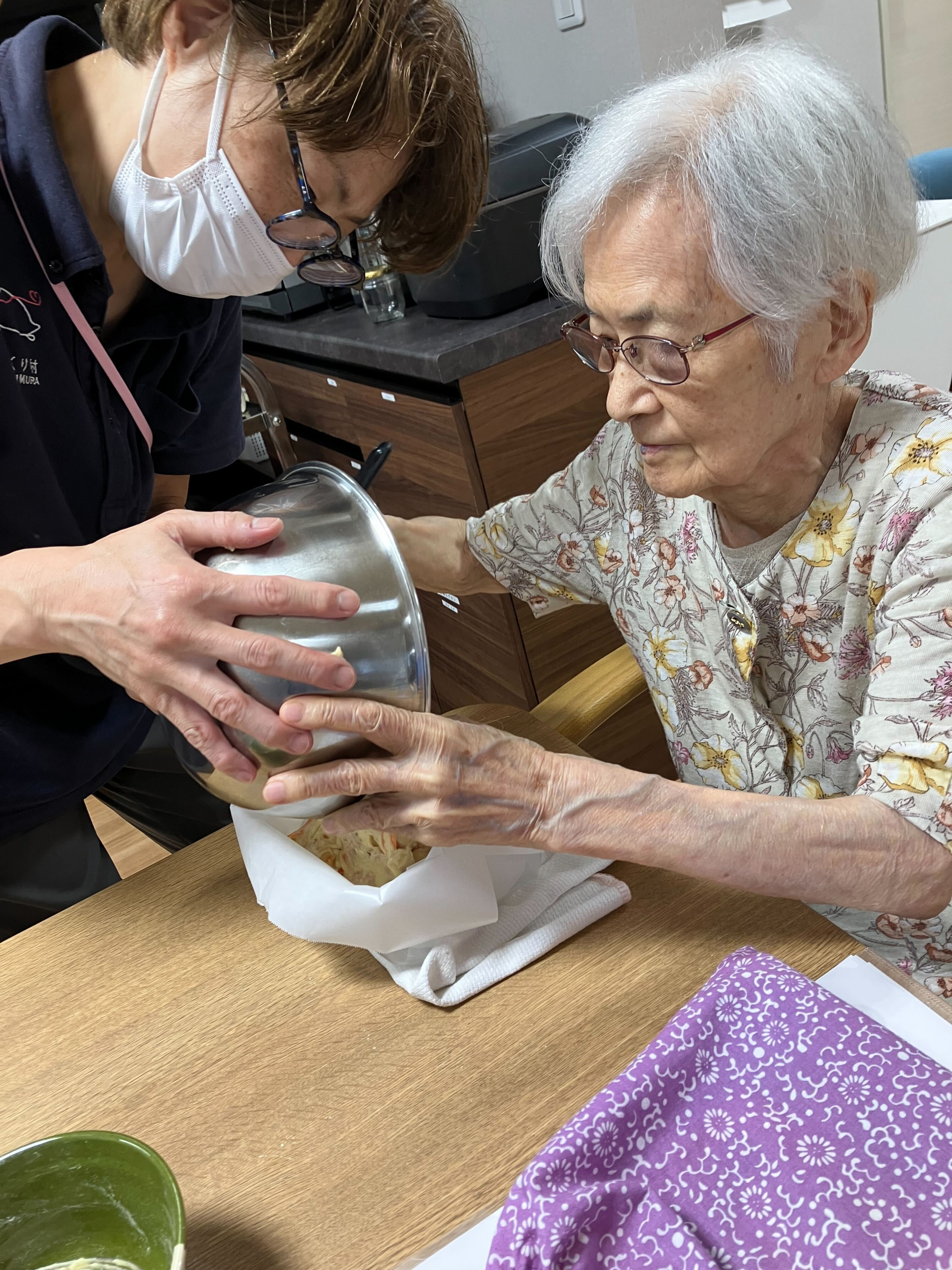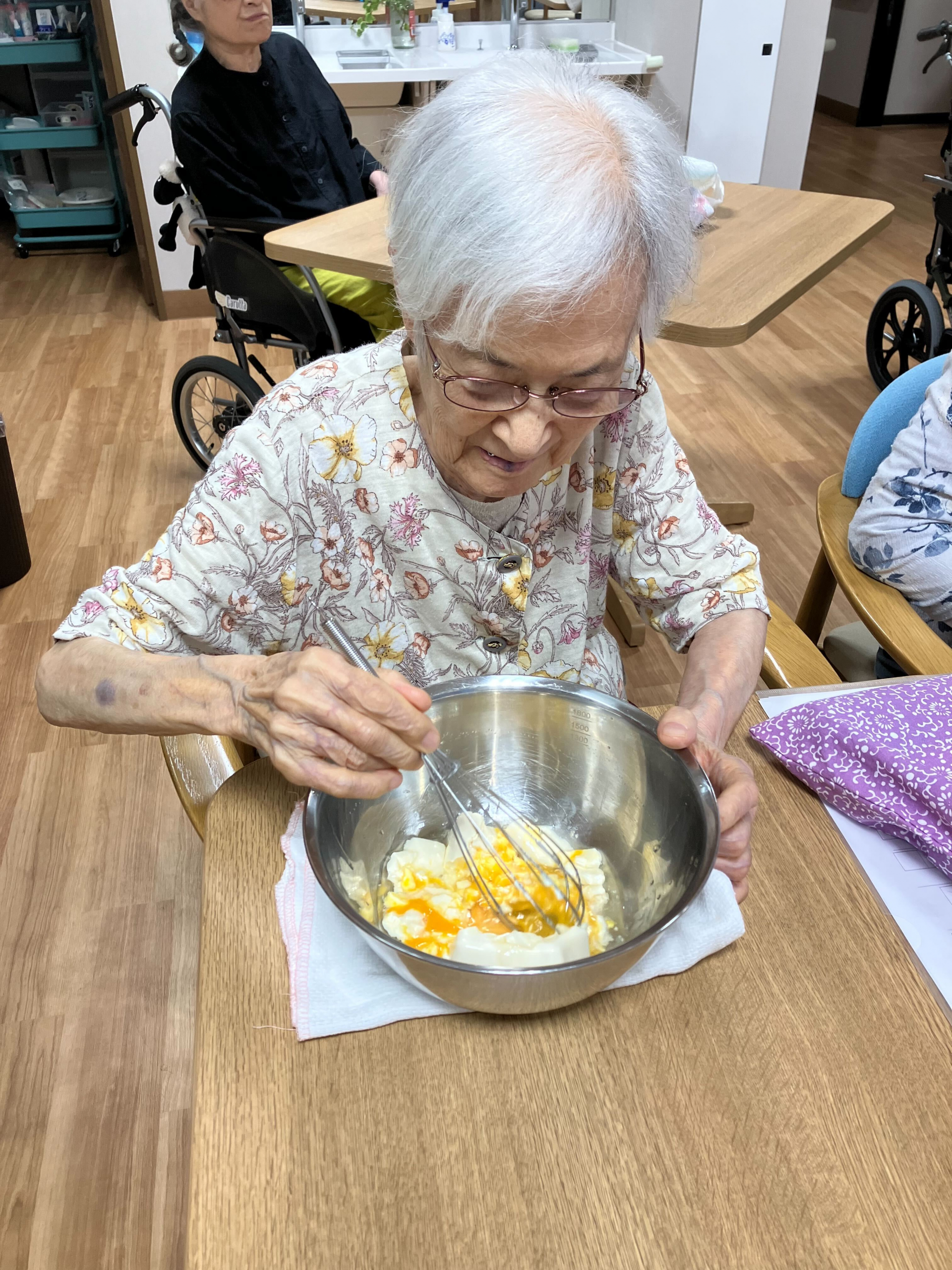 今日のおやつはO様と一緒に「キャロット蒸しパン」を作ります(^O^)
