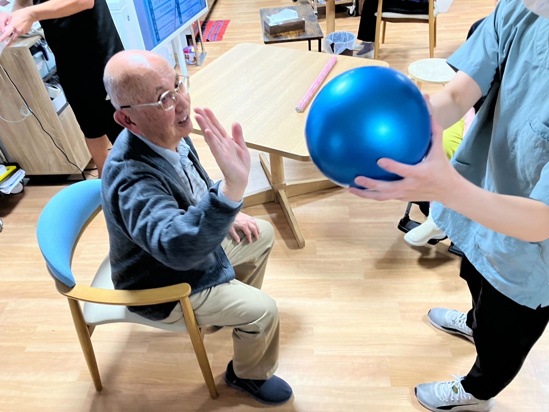 K様は棒を使って、関節をのばしたり、的確にボールに棒が当たるよう訓練中(^^♪