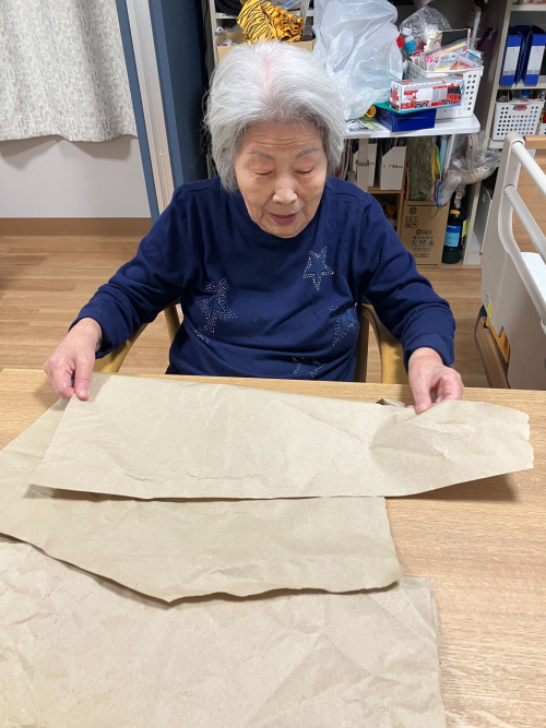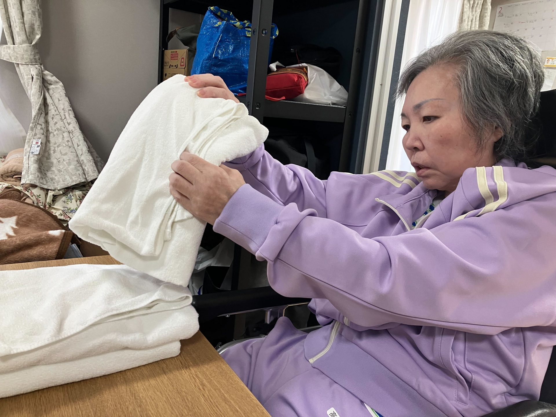 まずはタオルをたたんで手先のリハビリ♪