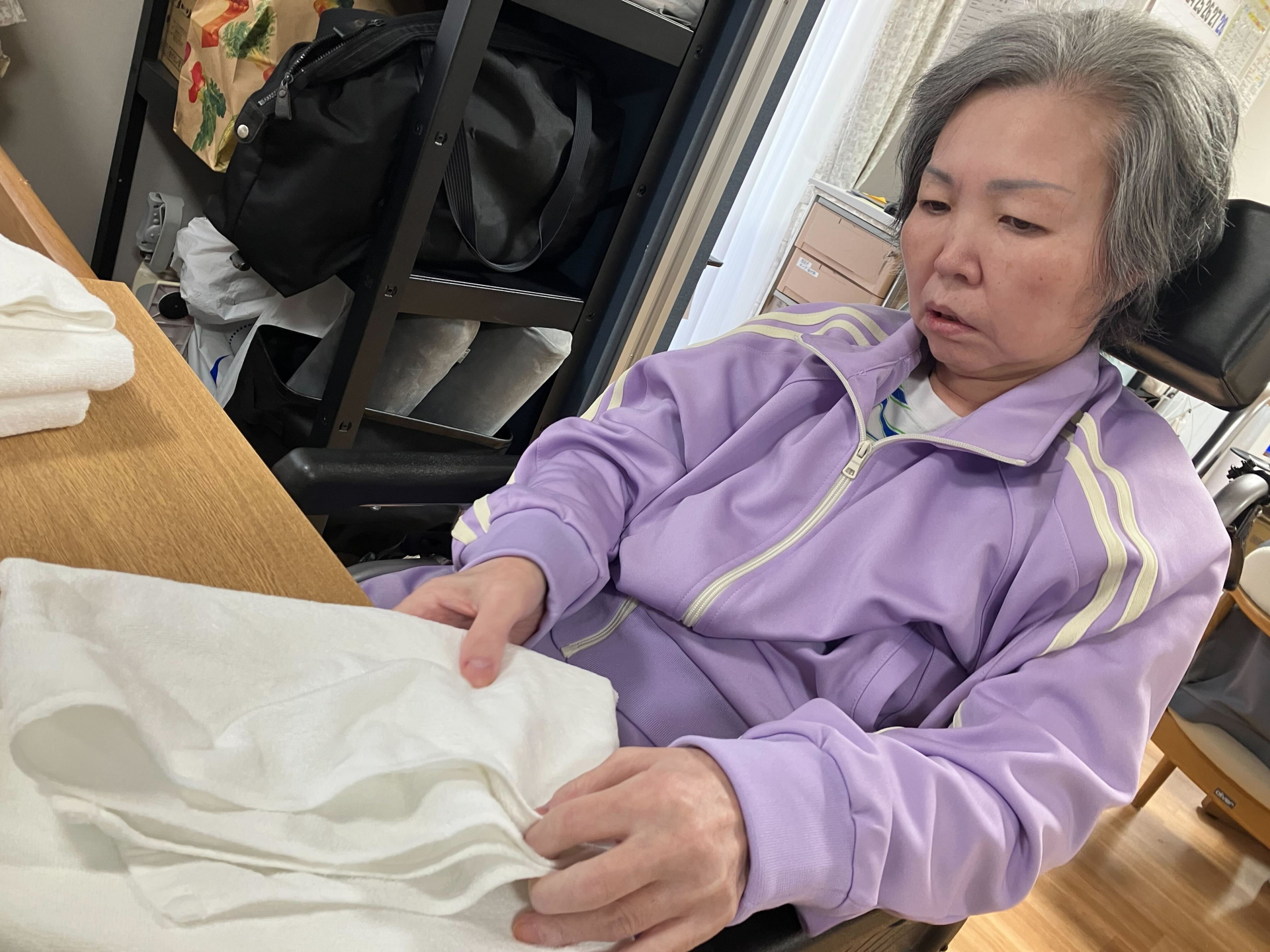 まずはタオルをたたんで手先のリハビリ♪