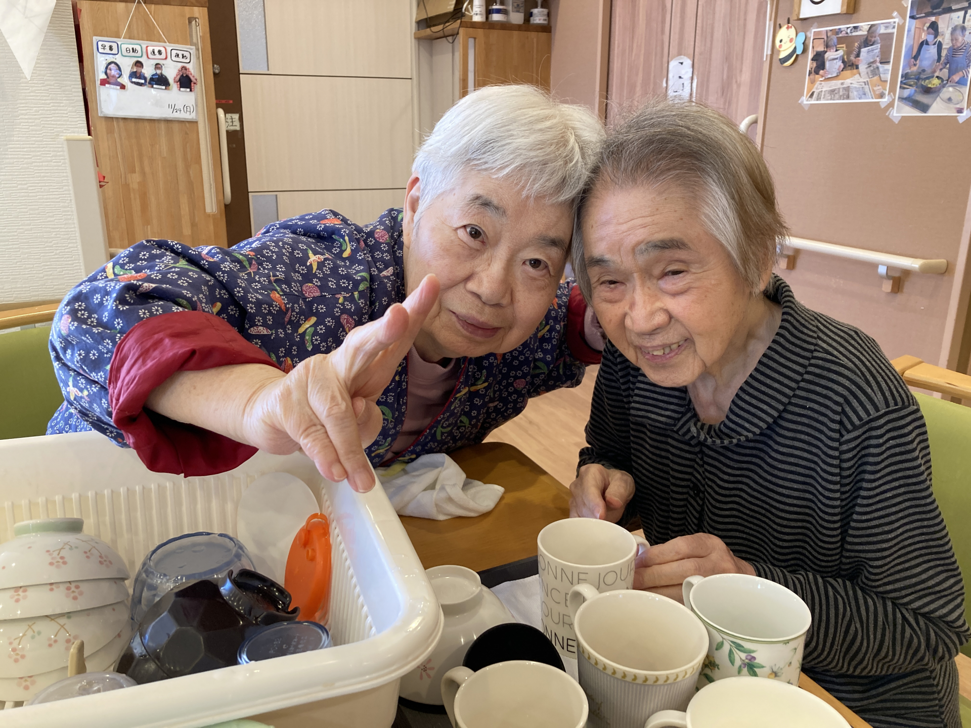 職員が食器を洗っているとK様が「その食器拭くよ」と言っていただき、またY様も「まだあるならこっちにも持ってきて」と家事を進んでやってくれました。