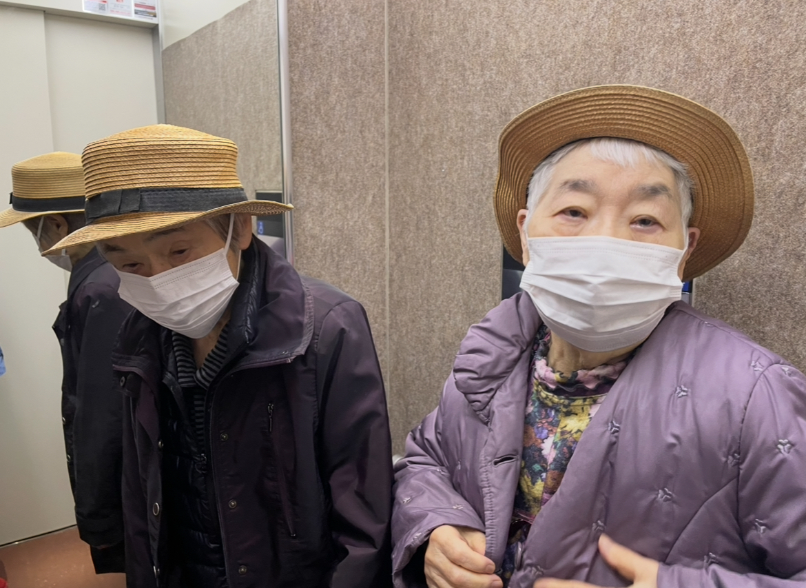 肩を寄せ合いながら落ち葉を手に取って「きれいねぇ」と笑いあうお二人