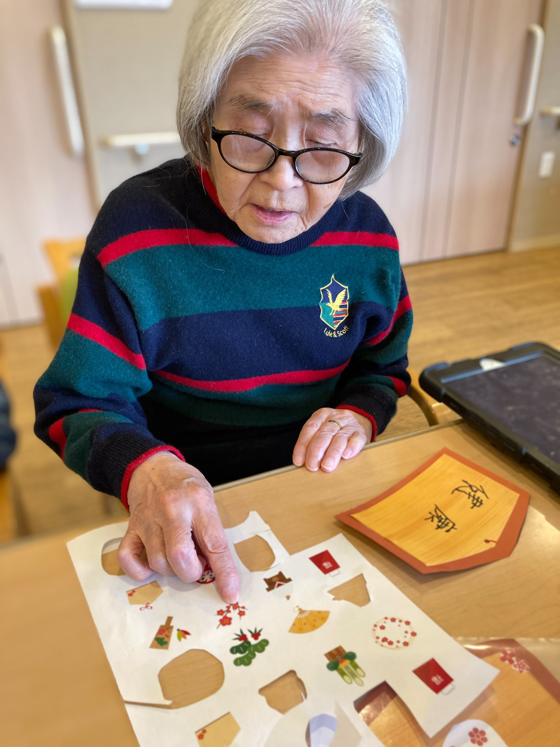 職員とやり取りをしながら進める場面や、出来上がった作品を見せ合う姿もあり、終始、穏やかであたたかい雰囲気の中で、ゆったりとした時間を過ごされています。