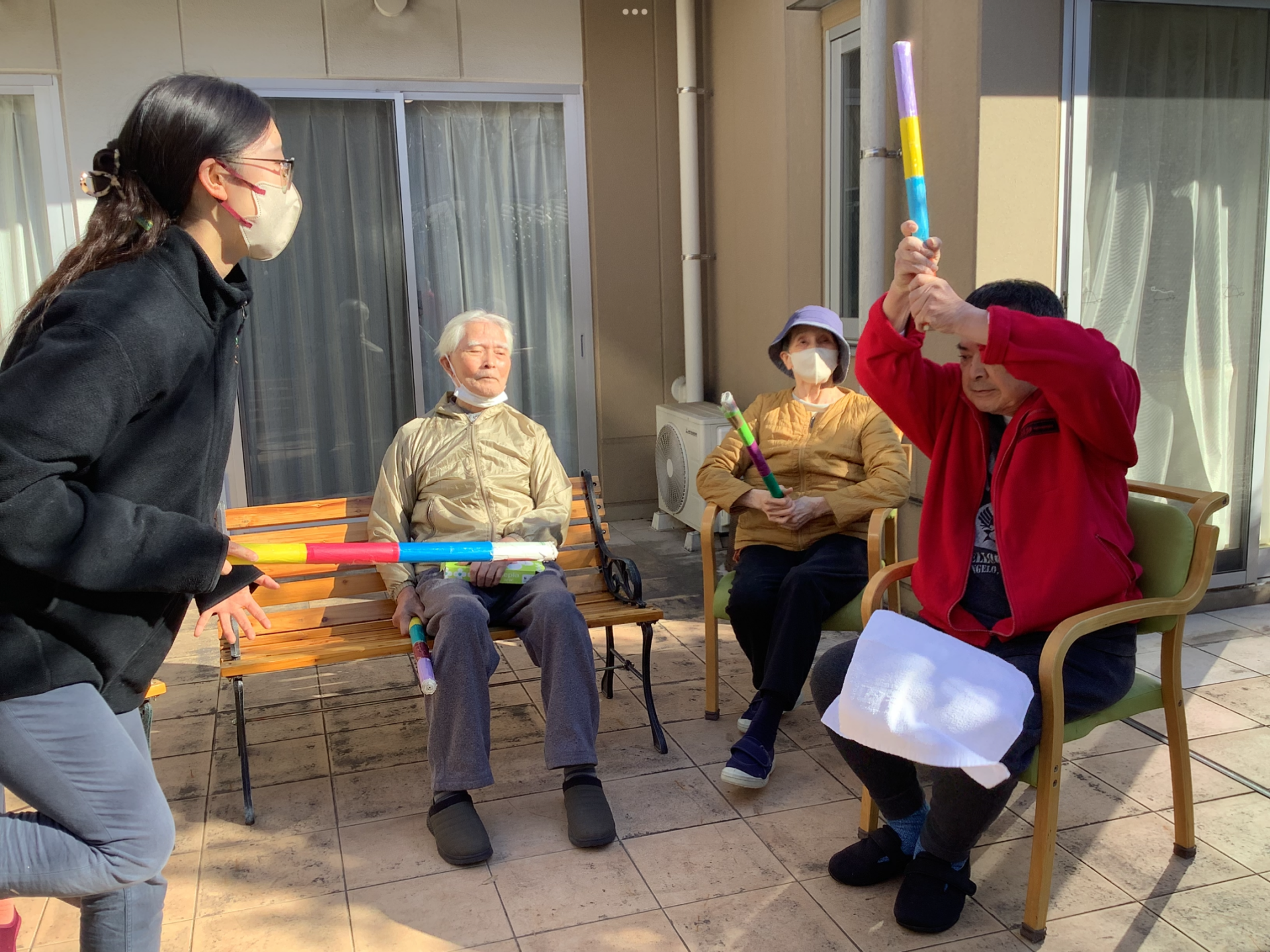 皆さんと中庭に出て楽しいレクリエーションができました!