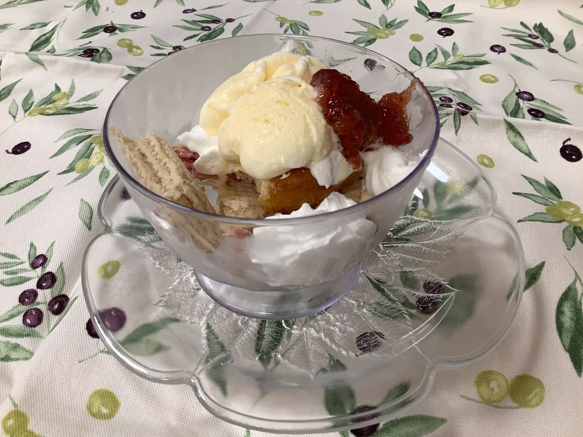 色とりどりのイチゴジャムやホイップクリームやアイスクリームやビスケットがパフェに乗った