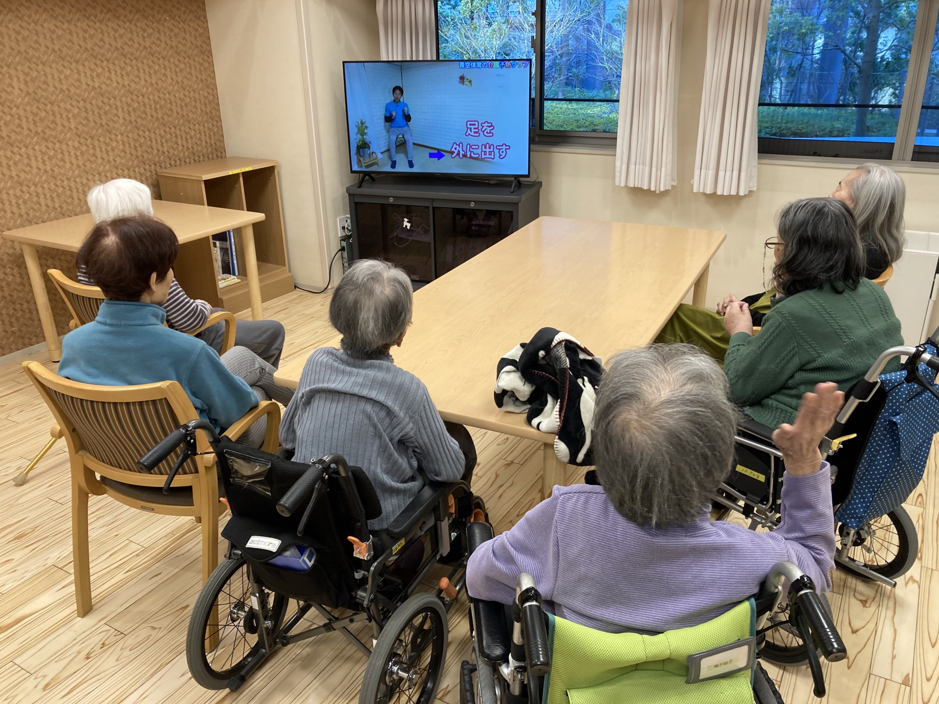 今日は、テレビで「歌体操」の動画を見ながら、皆様で体操を行いました。