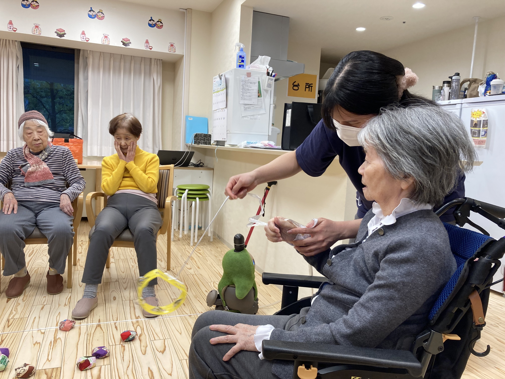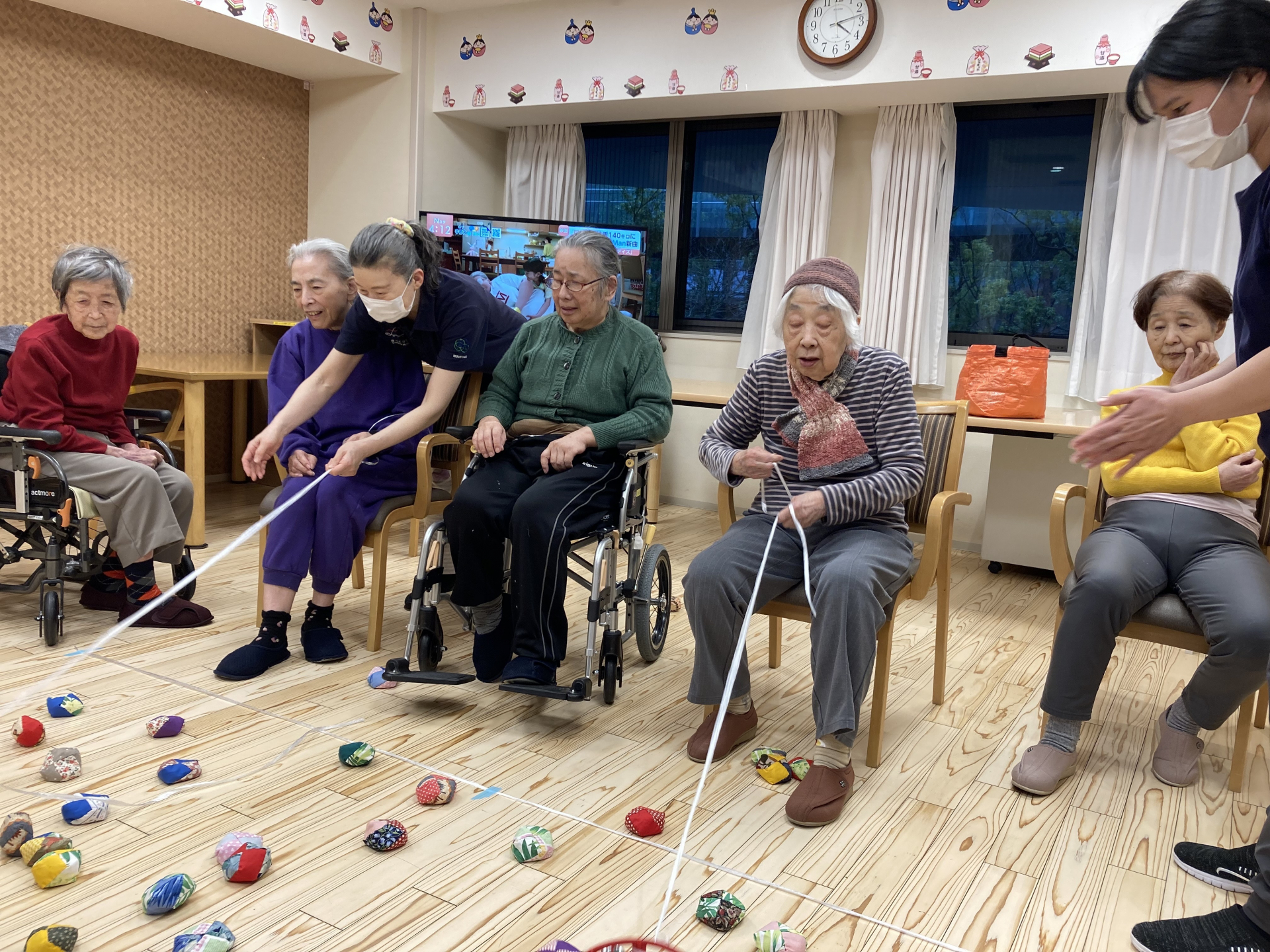 本日のレクでは、「お手玉引っ張れゲーム」を行いました。