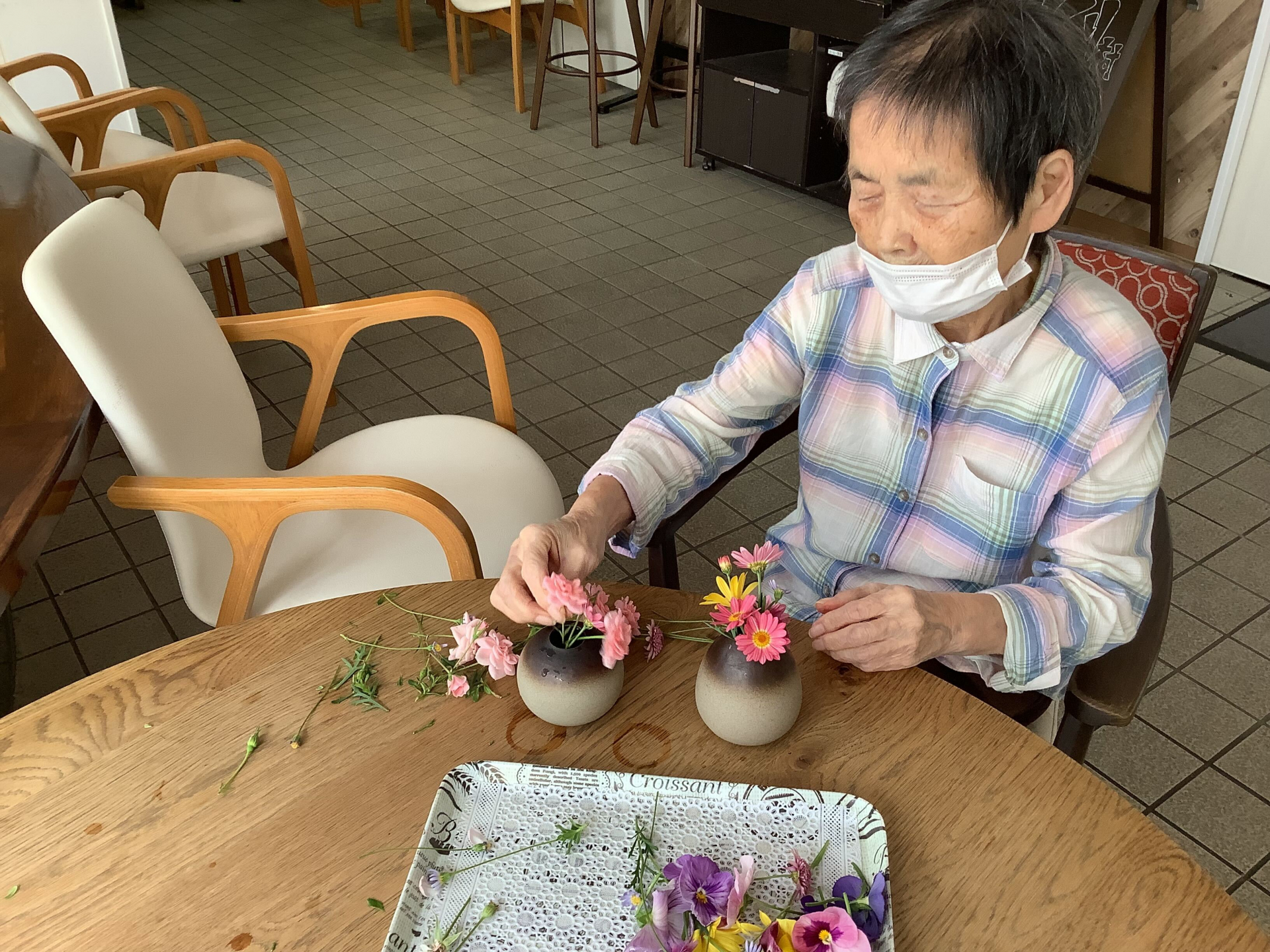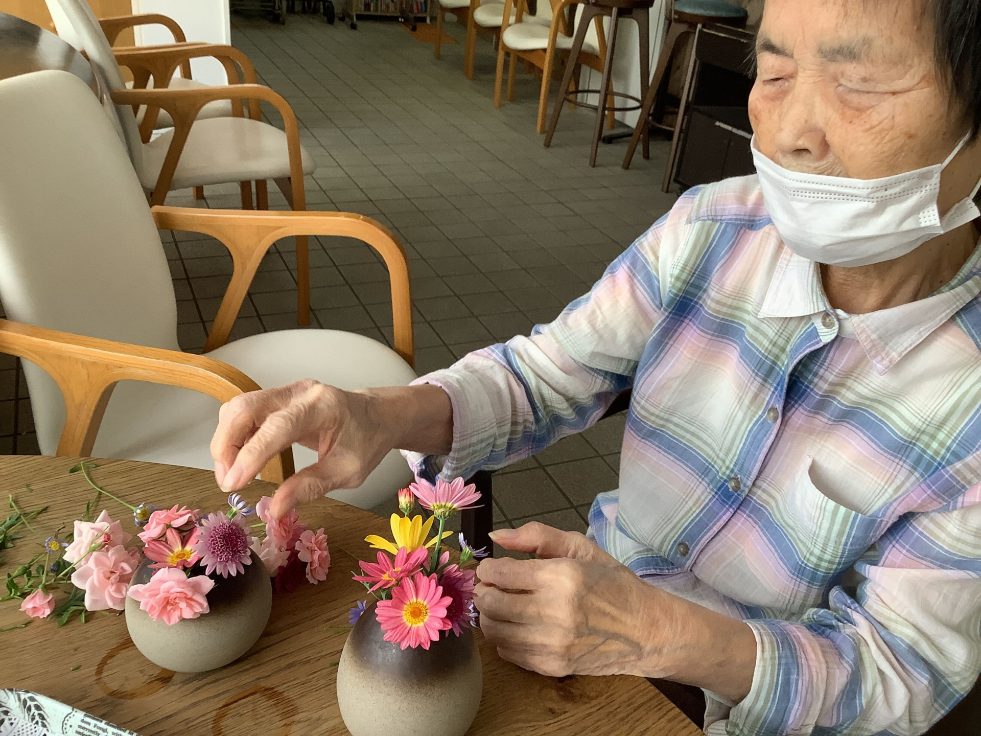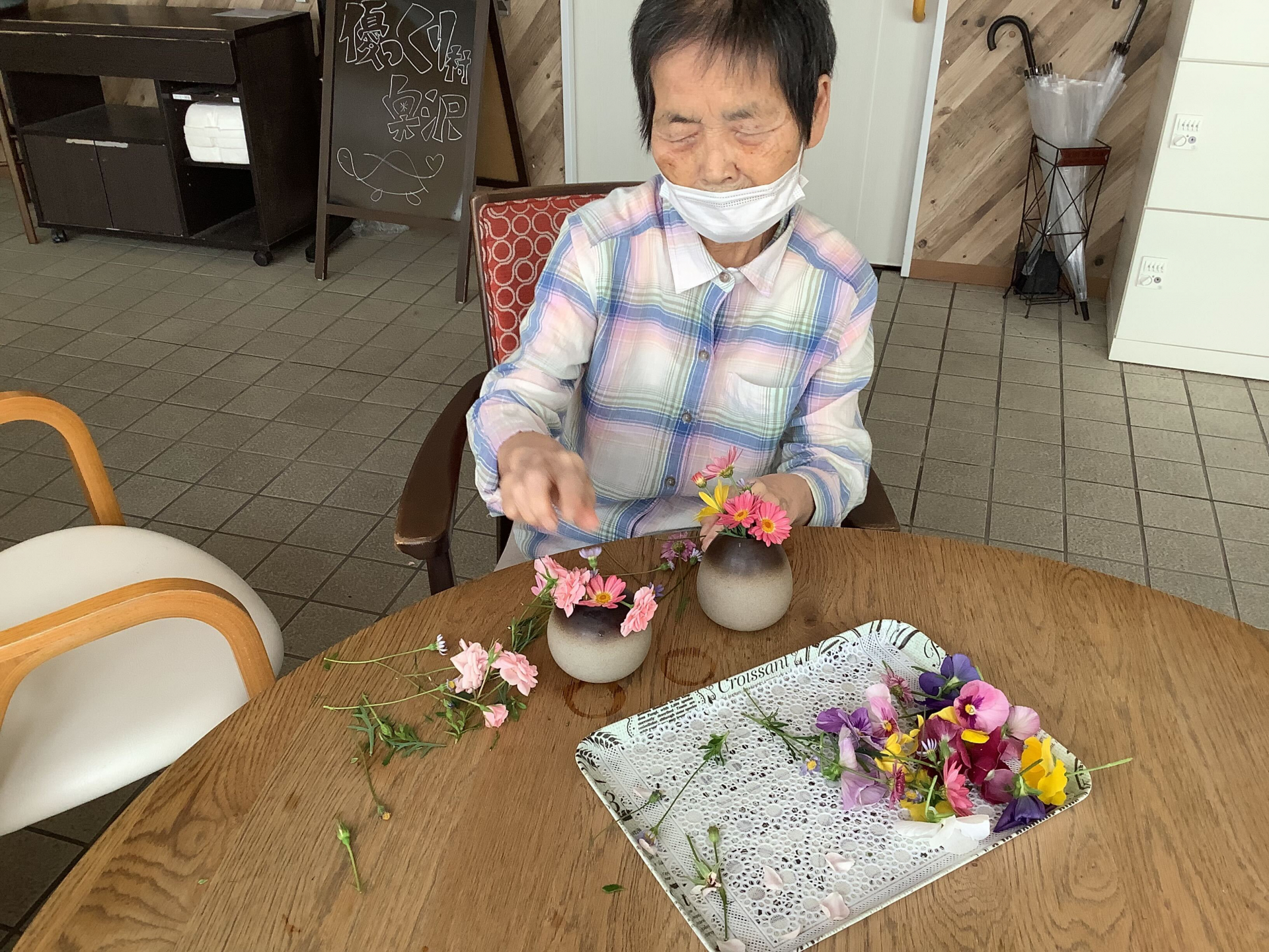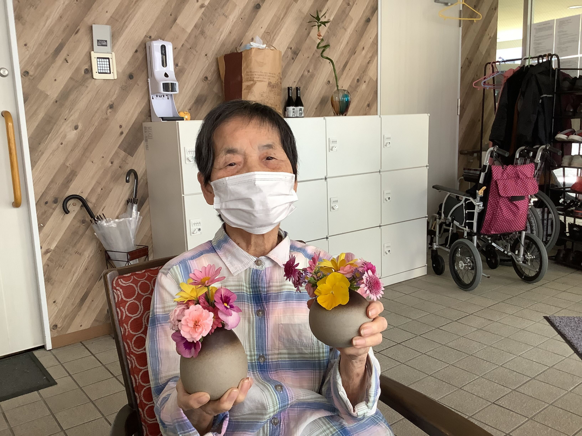 Di bulan ini banyak bunga bermekaran, di depan panti pun ada taman yang tidak cukup luas, tapi panjang ada di sebelah bahu jalan, ada banyak jenis dan warna bunga yang bermekaran. Mungkin, setiap seminggu 2x 利用者様(riyousha sama) memetik bunga bersama perawat. Setelah memetik bunga, 利用者様(riyousha sama) bersama perawat merangkai bunga di vas kecil, dan di letakkan di meja sebagai hiasan.