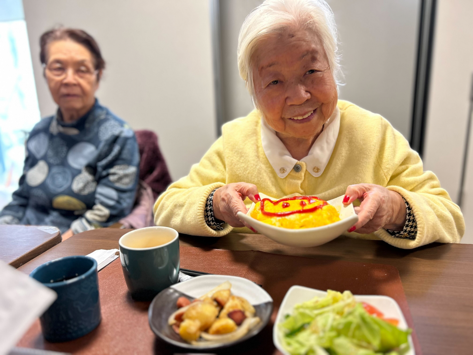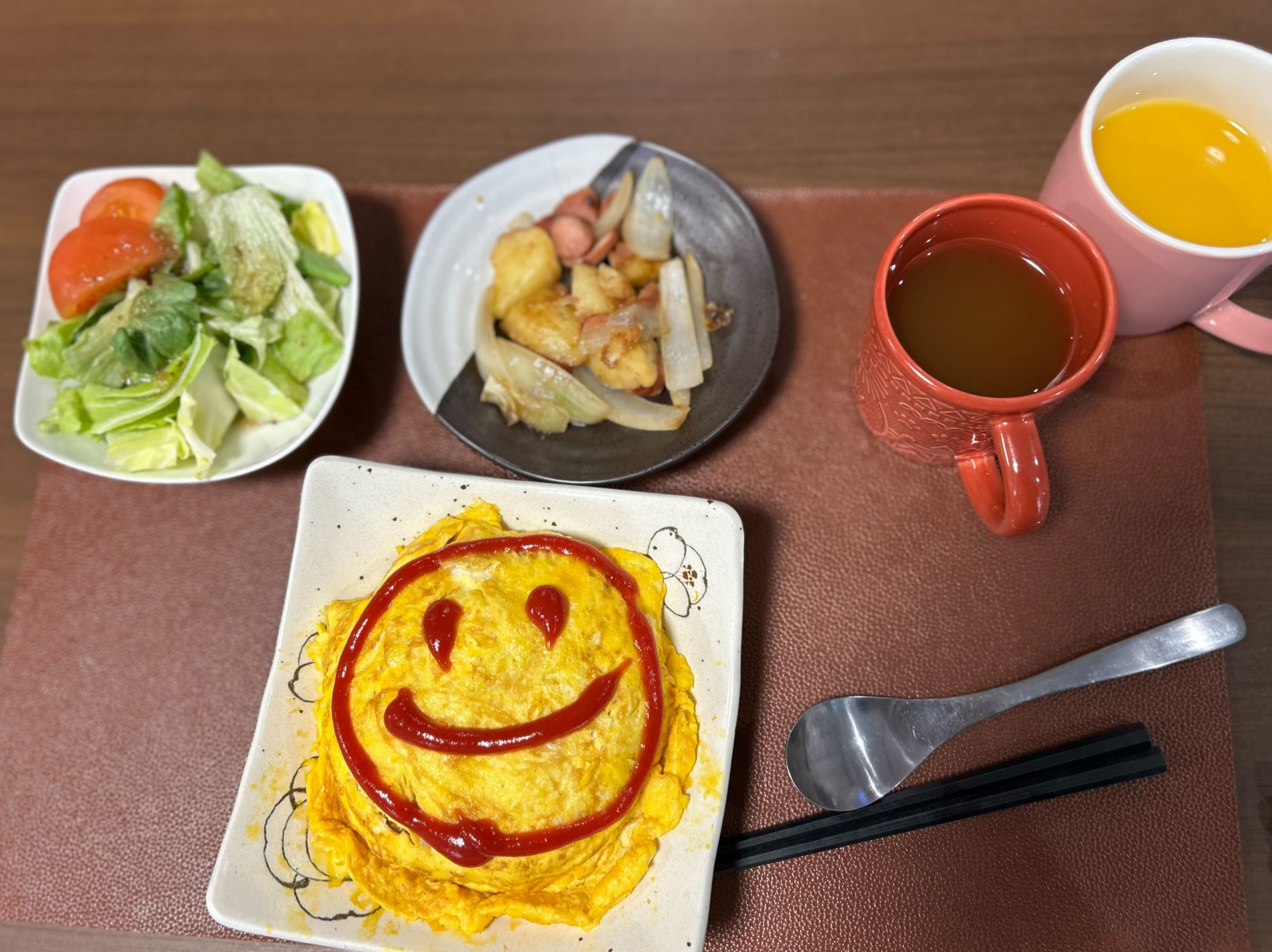 とある日の昼食メニューがオムライスだった為、にこちゃんマークを描いてご提供しました♪