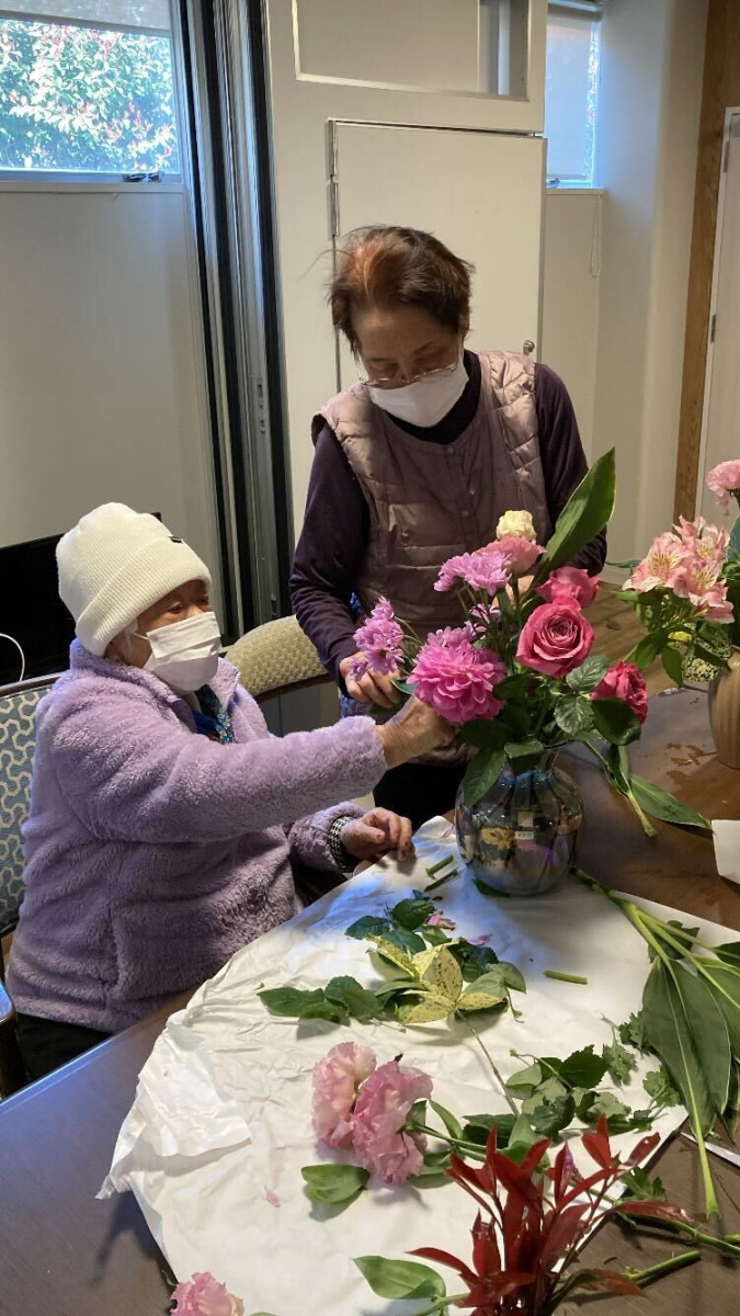 ご利用者様同士で協力して花瓶にお花を入れています(*'▽')/