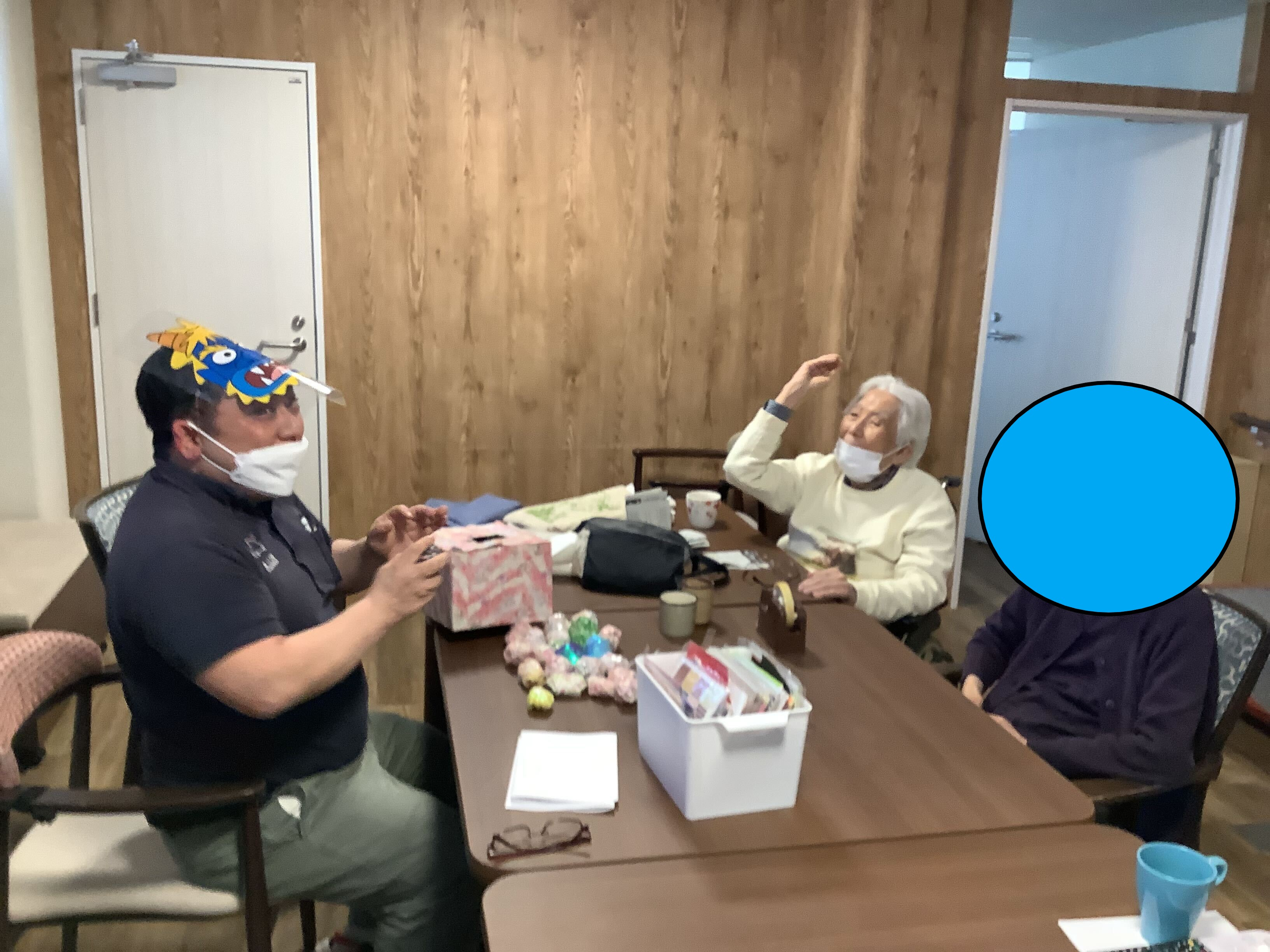 優しい利用者が多いので、鬼に扮した職員に豆を当ててくれず、賽銭箱に見立てた箱に投げ入れる計画を立てています