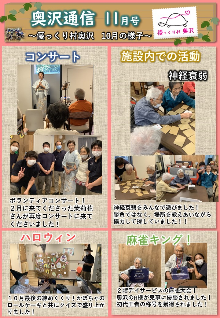 奥沢通信11月号です!10月の優っくり小規模多機能介護奥沢の様子をお伝えします!