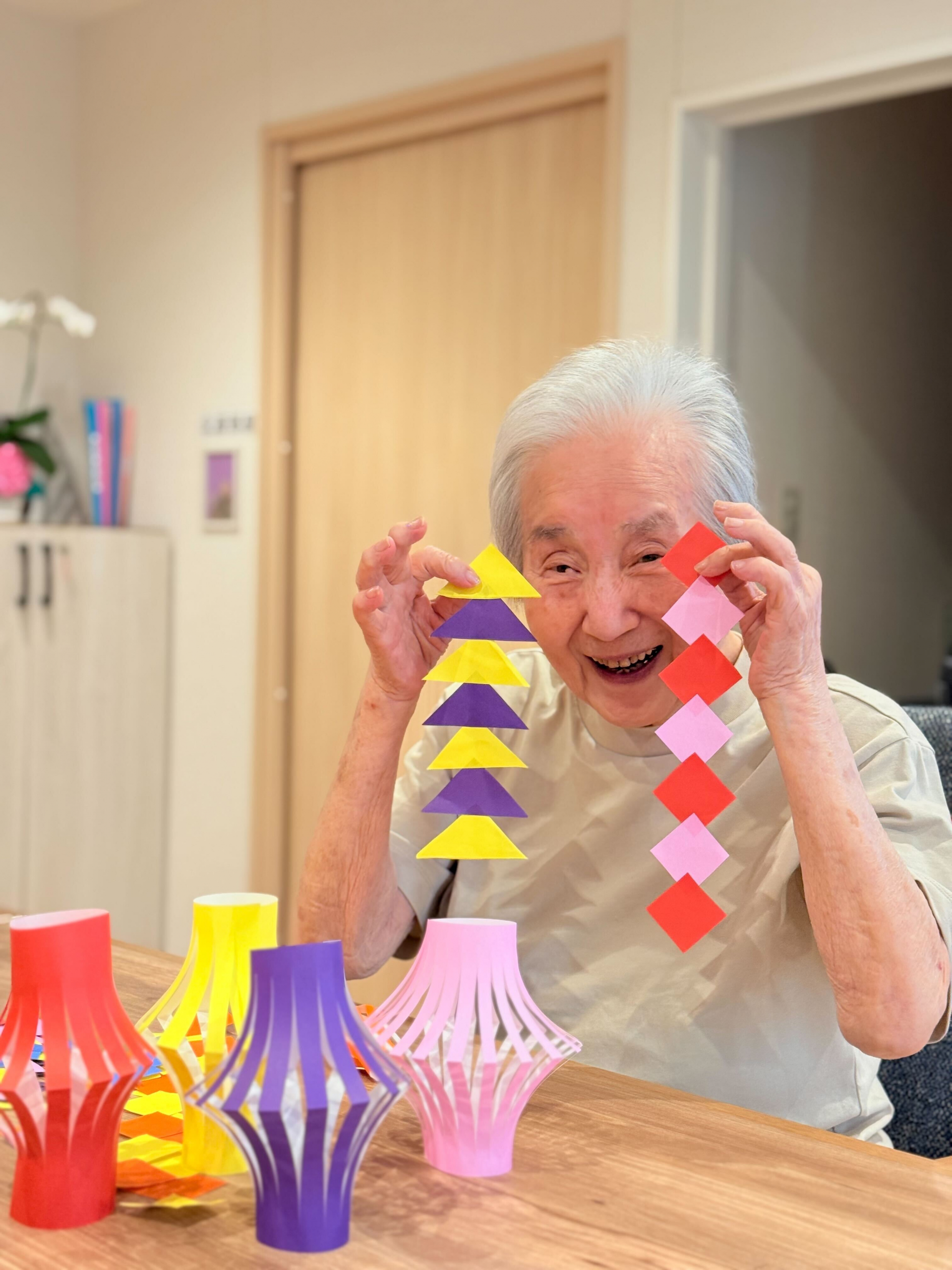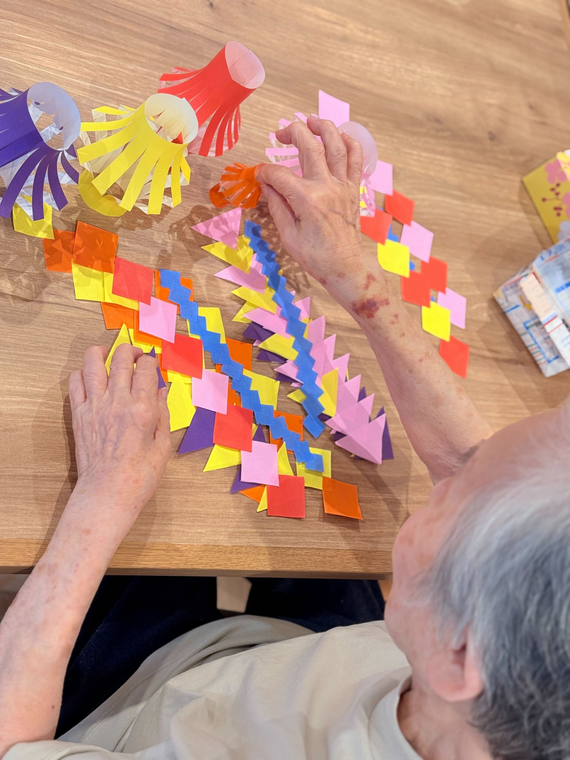 指先を使う創作活動は、リハビリ効果はもちろん、完成した時の達成感や周りの方との会話も自然と生まれ、笑顔があふれるひとときに。