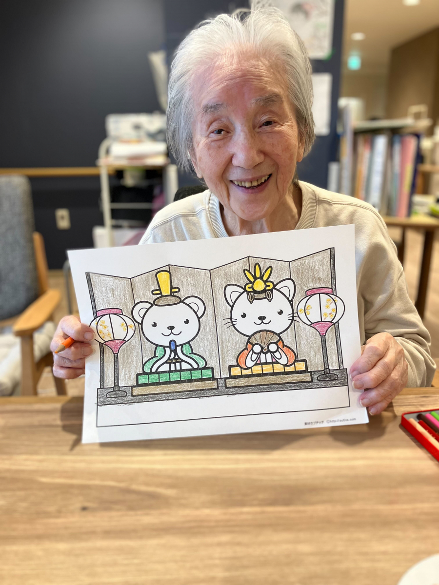 2026.03.31 活動報告 楽しいひな祭り Tweet シェアする ぬりえも可愛く塗れました(o^―^o) ひな祭り当日はメイクをして、さらに素敵な笑顔です。おやつはイチゴジャム入り蒸しパンを作りました。 両国看多機 島津 前の記事 2026.03.31 活動報告 赤、白、黄色 次の記事 2026.03.08 活動報告 奉優会イベント参加! 「事例研究発表会」 一覧へ戻る