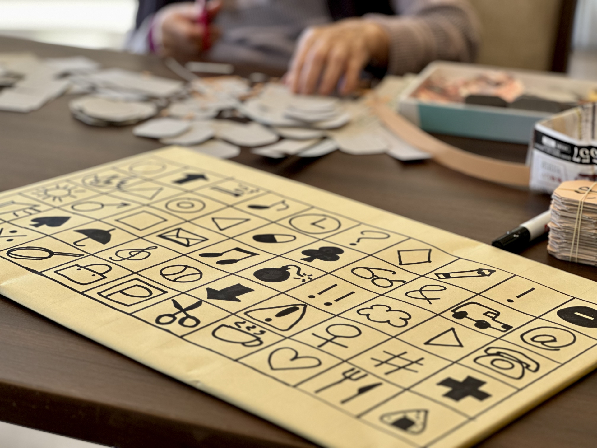 職員がパズルのベースを作り、そこに描かれた記号を切り抜いたピースにマネして描いて下さると完成です♪