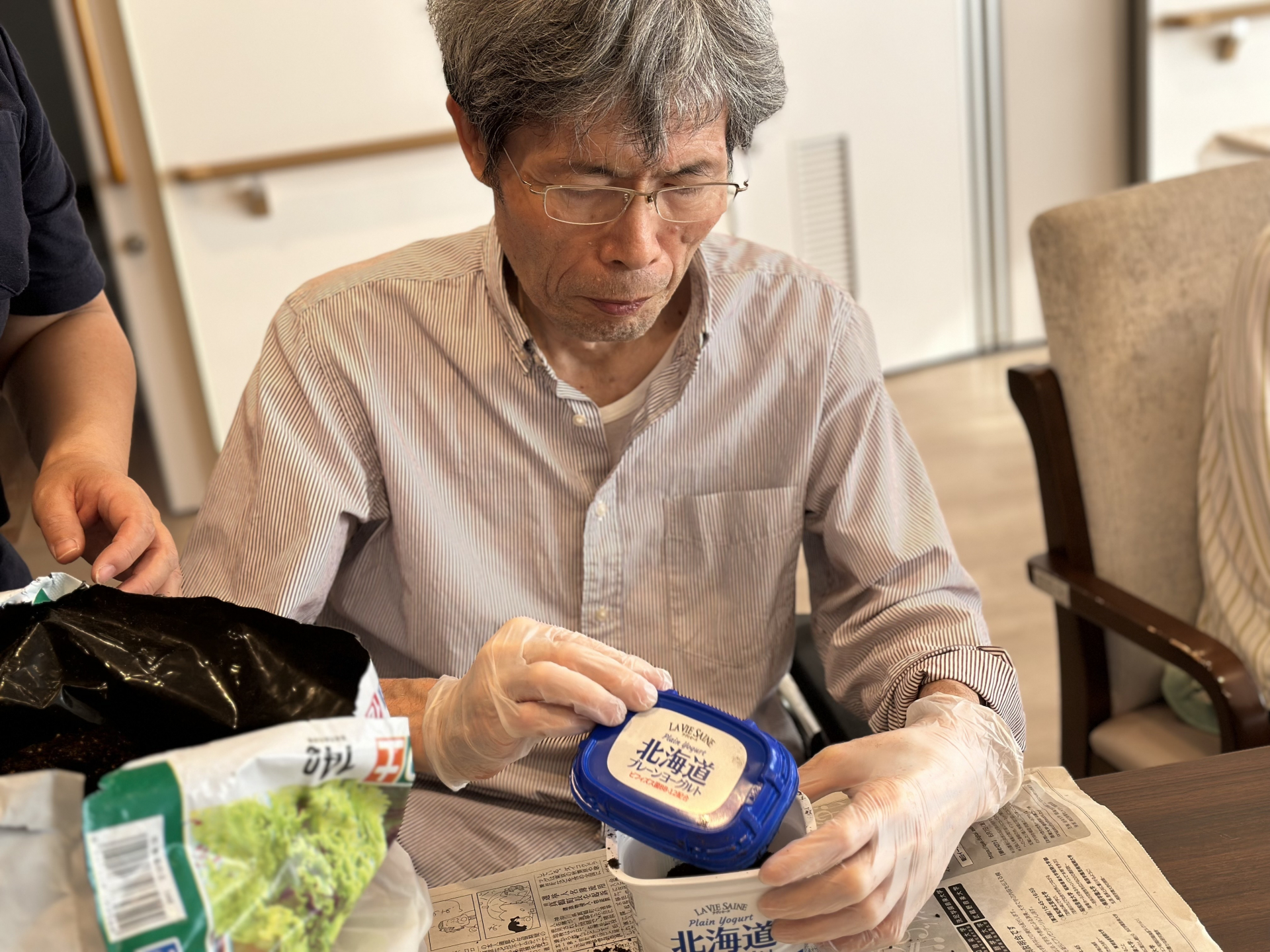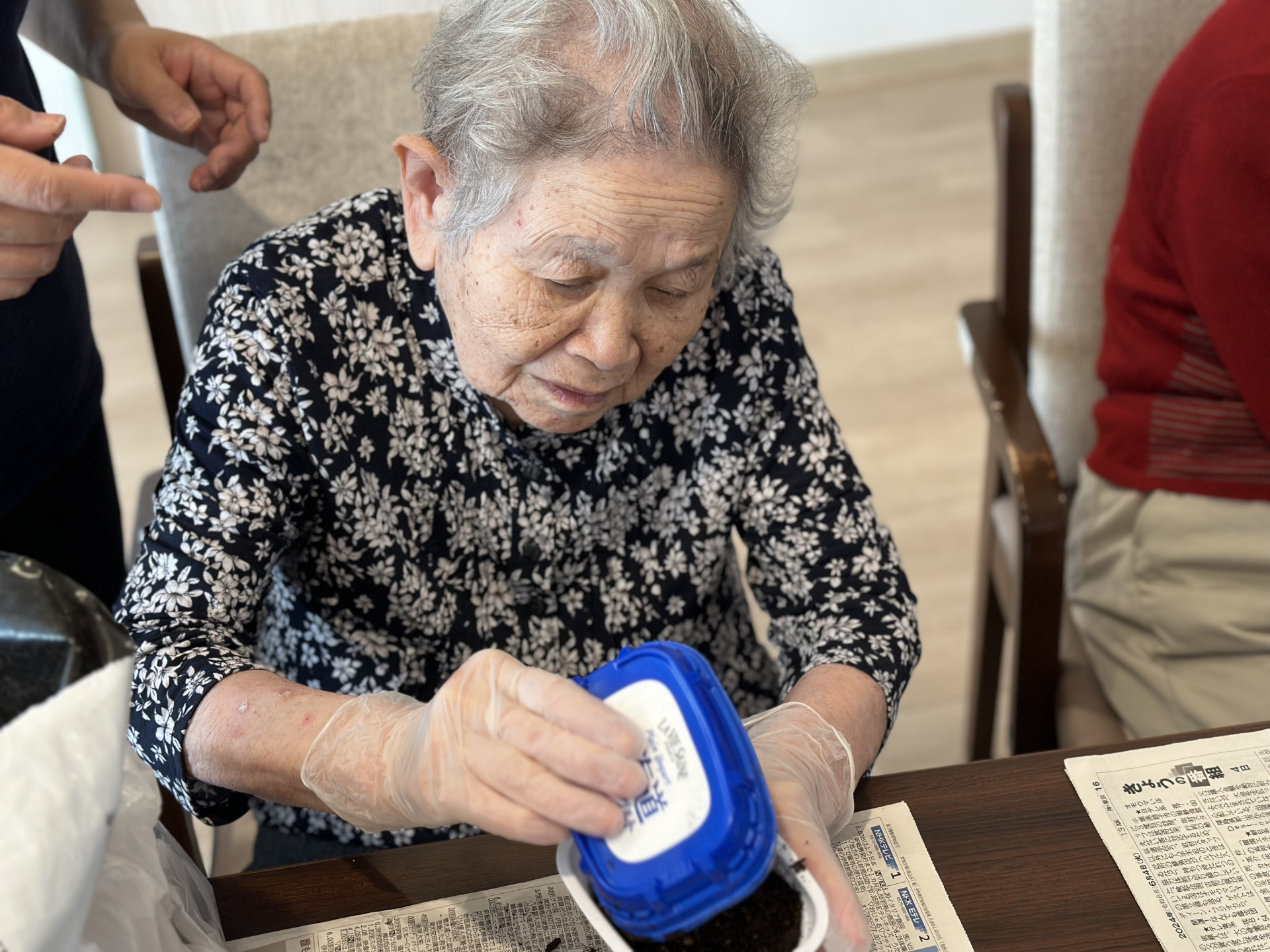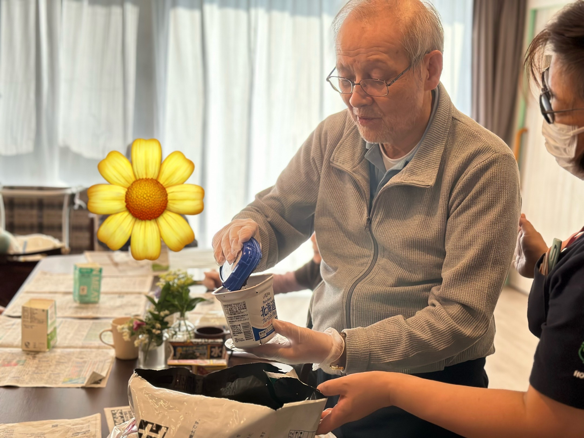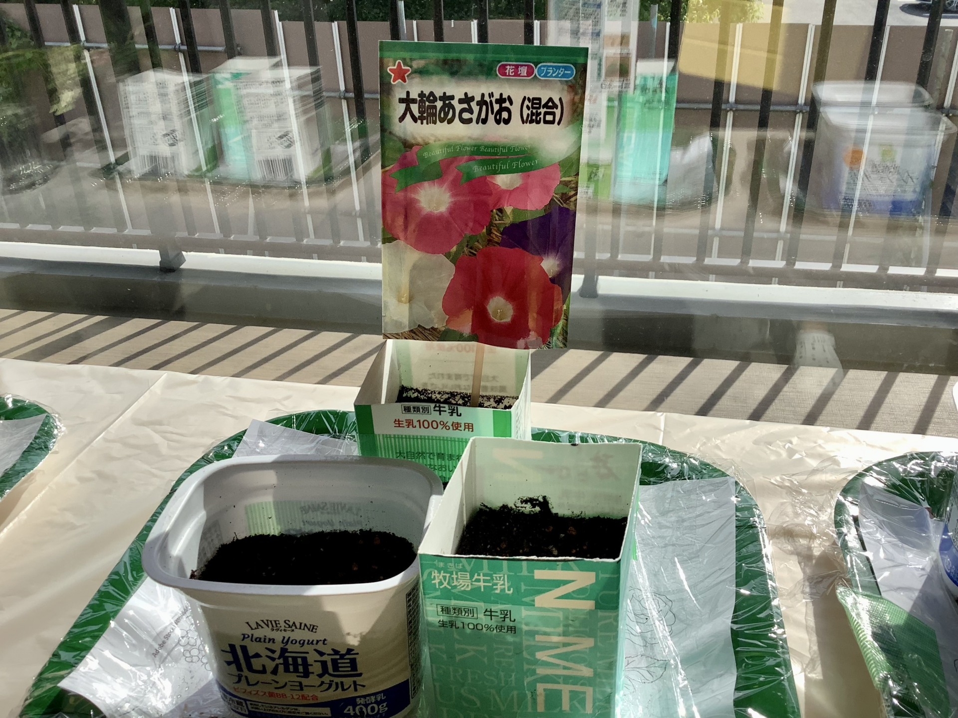 【一人一鉢】という事で、皆さんお一人おひとり牛乳パック等を活用してあさがおの種を植えました♪