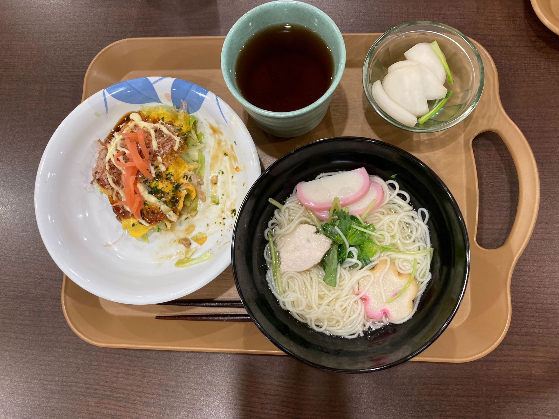 メニューはにゅうめんとキャベツと豚肉の豚平焼き、カブの浅漬けです(*^-^*)