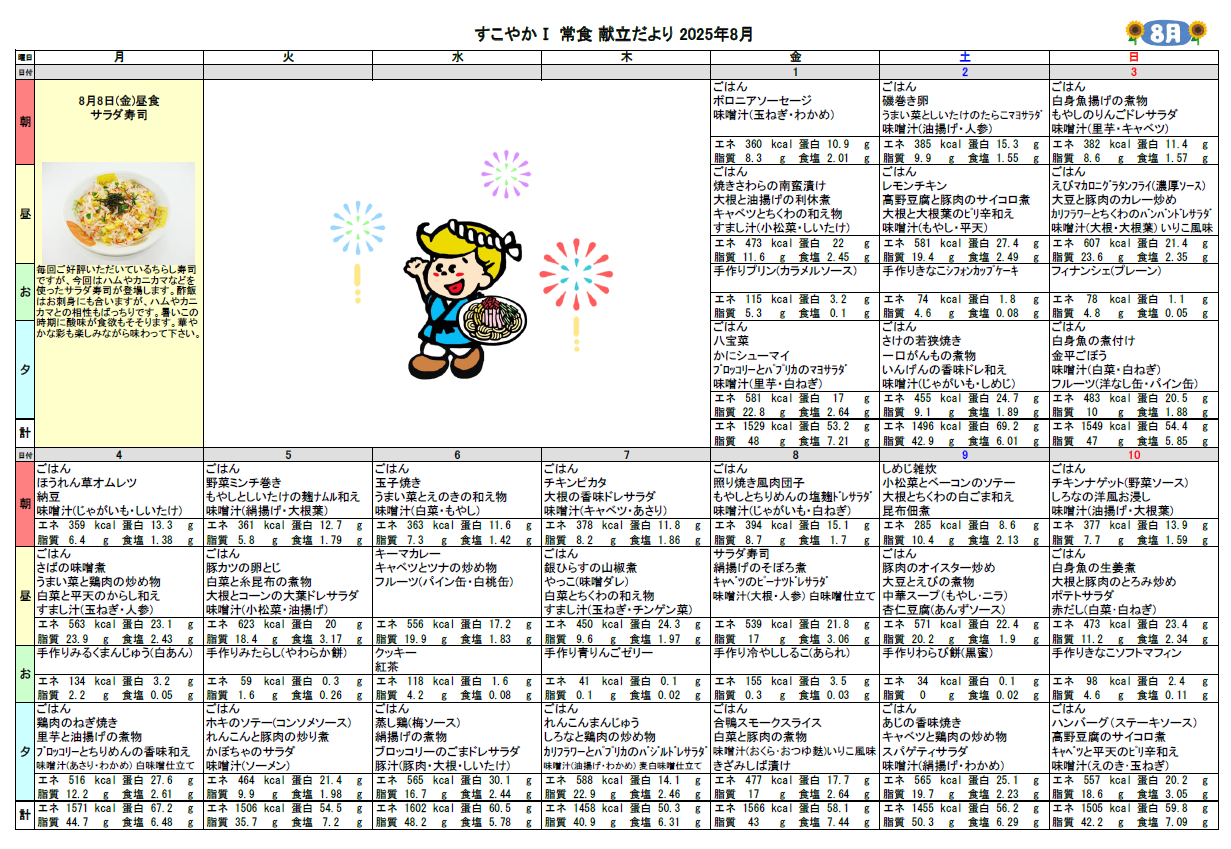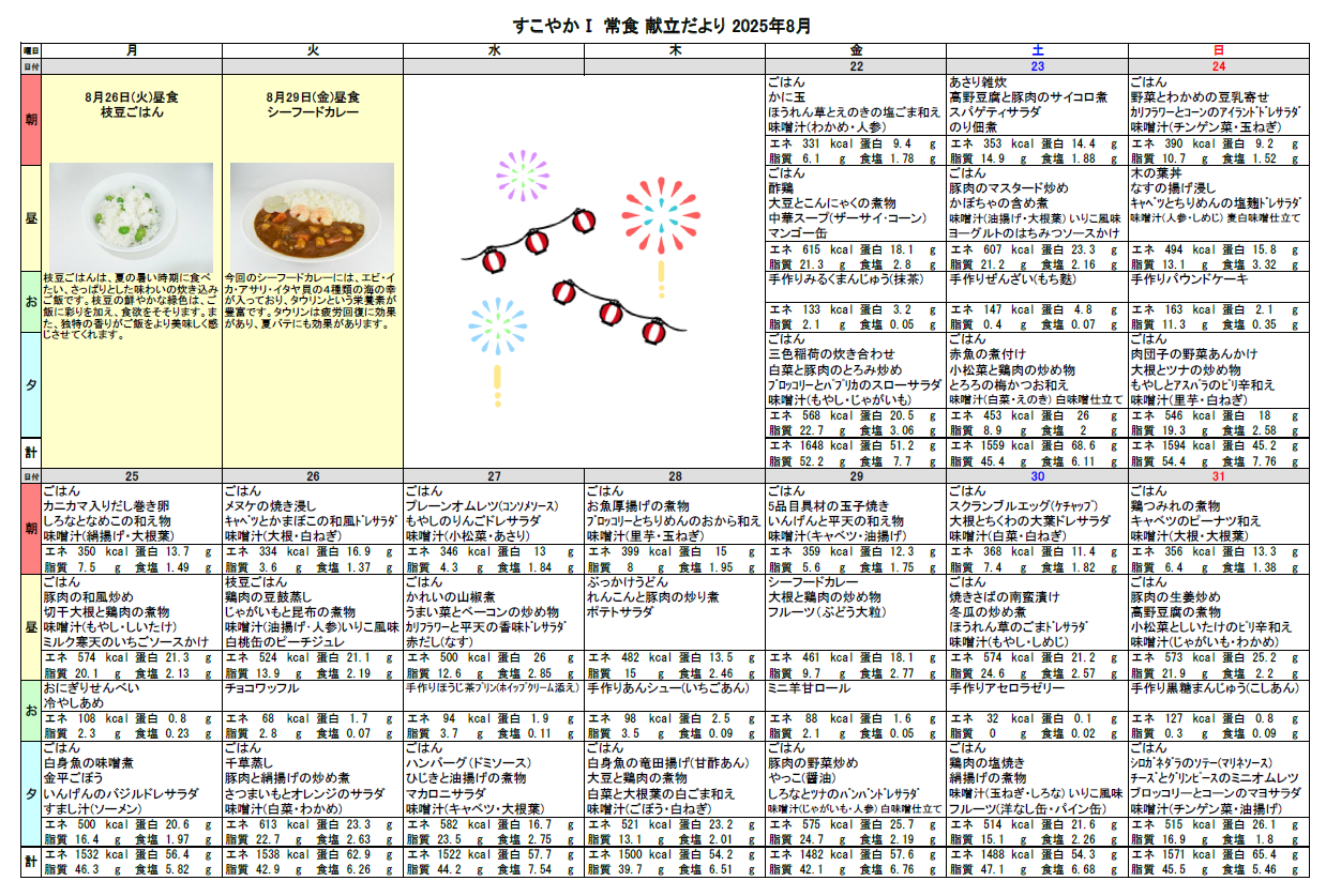 2025.07.30 お食事 8月の献立♬ Tweet シェアする 8月の献立をお伝えします☆彡 優っくり村下馬 杉原 前の記事 2025.07.30 お食事 【グループホーム雰囲気】8月壁紙作り☆彡 次の記事 2025.07.30 お食事 【グループホームの雰囲気】昼食♬ 一覧へ戻る
