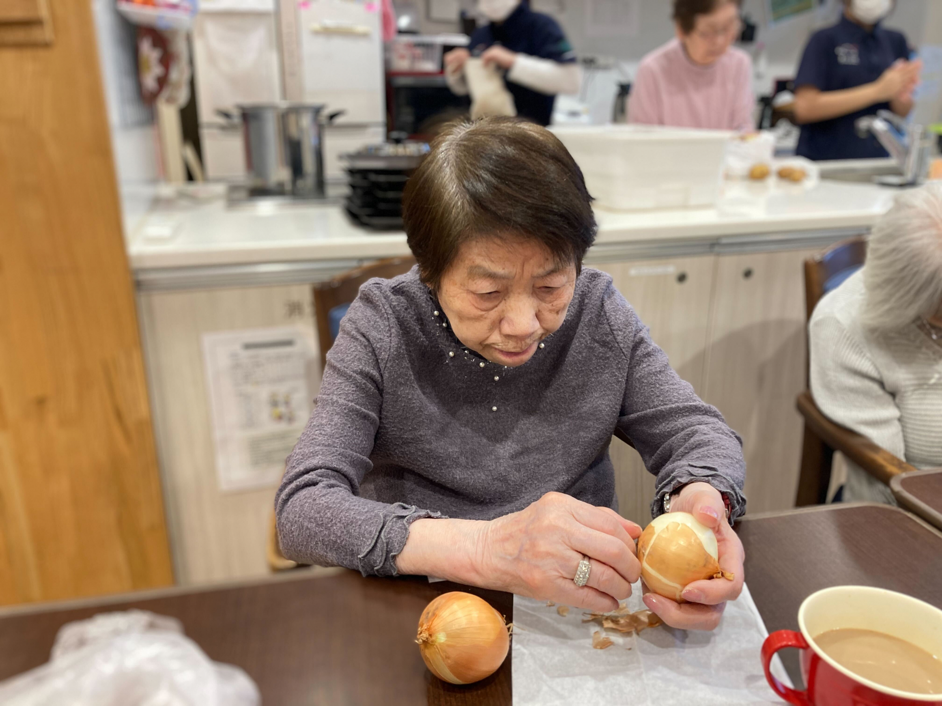 当日の昼食は、シチュー、ゆで野菜サラダ、サーモンのテリーヌ、手作りパン、カルピスをご用意しました。シチュー作りには、主に6丁目ユニットのご利用者様にお手伝いいただき、野菜を切ったり、たまねぎの皮をむいたり、具材を炒めたりと、それぞれ出来る作業に積極的に参加してくださいました♬