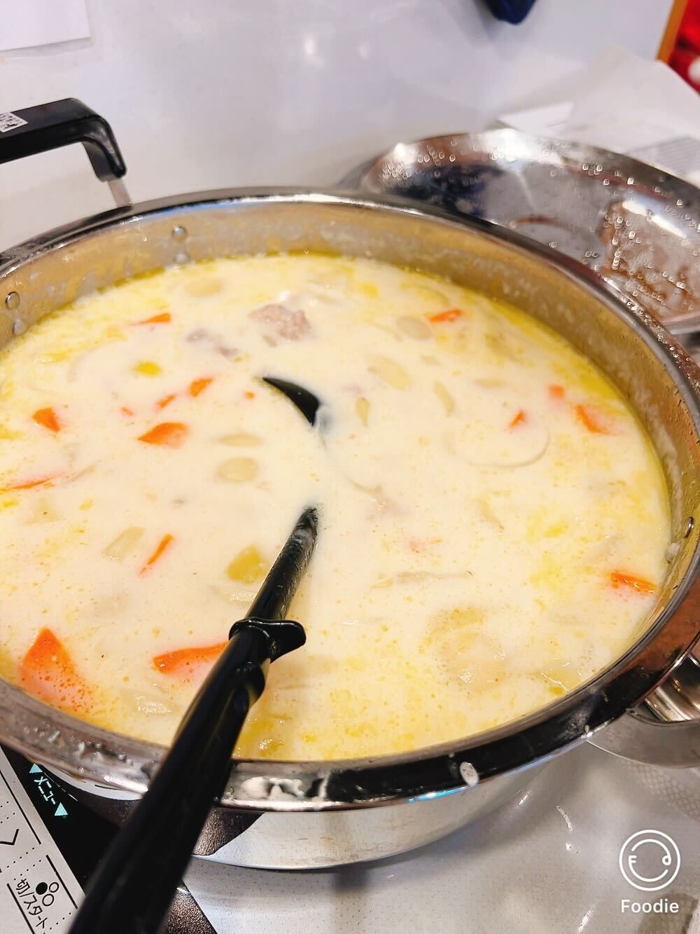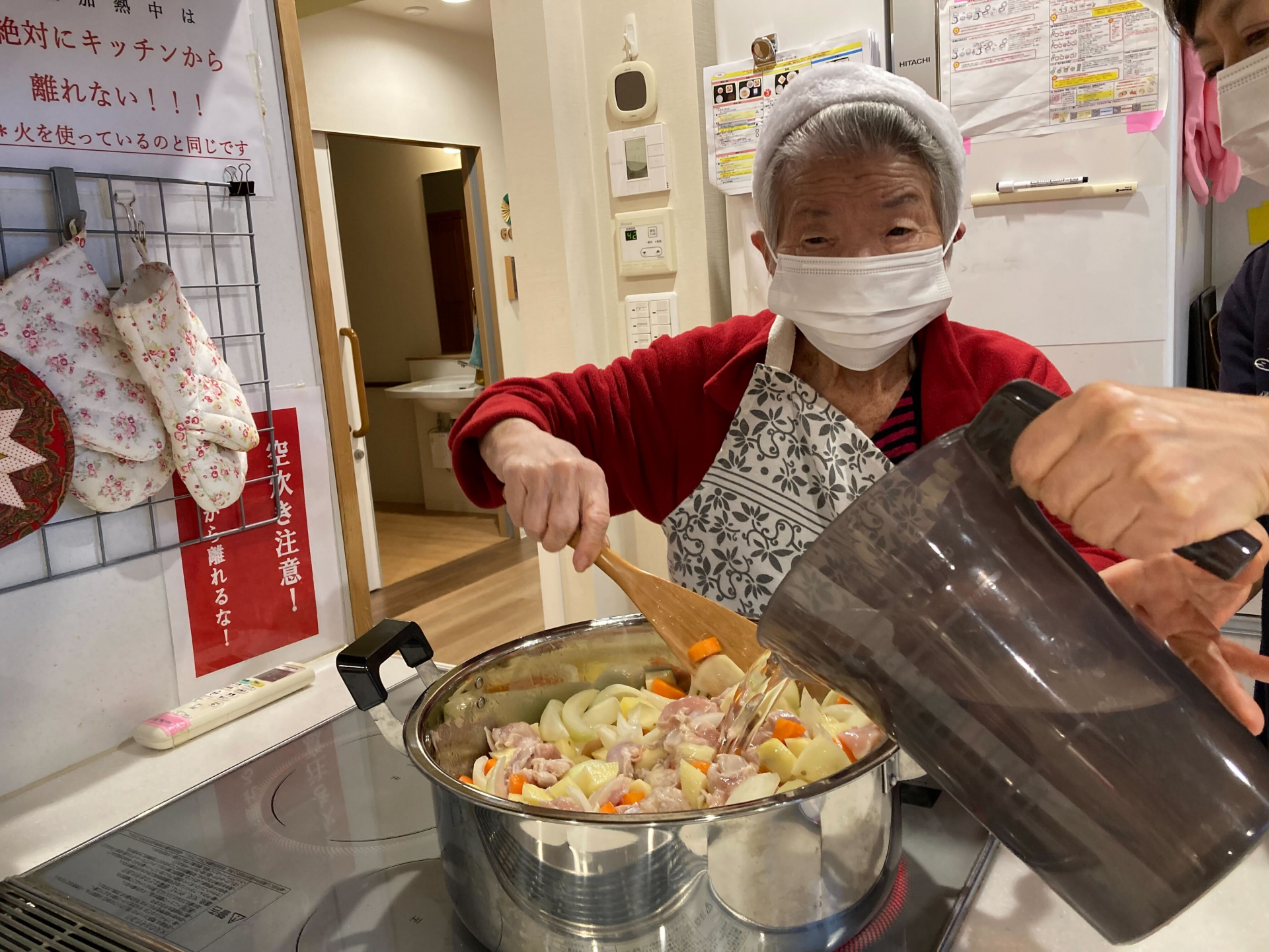 当日の昼食は、シチュー、ゆで野菜サラダ、サーモンのテリーヌ、手作りパン、カルピスをご用意しました。シチュー作りには、主に6丁目ユニットのご利用者様にお手伝いいただき、野菜を切ったり、たまねぎの皮をむいたり、具材を炒めたりと、それぞれ出来る作業に積極的に参加してくださいました♬