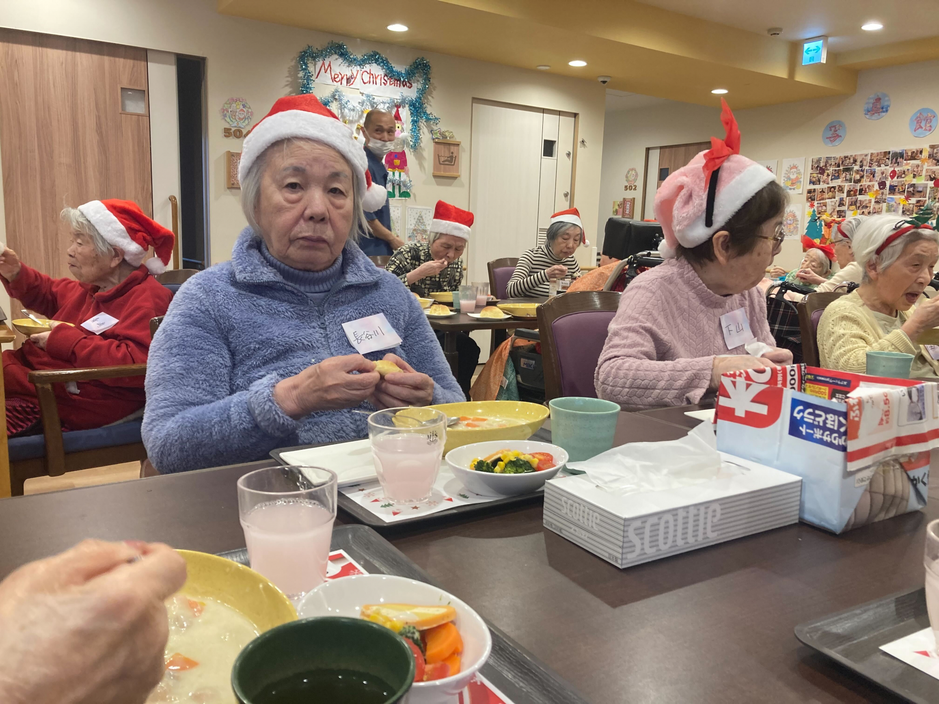 食事の時間には、「おいしいね」「あたたまるね」といった声も聞かれ、皆様終始笑顔で、和やかなひとときを過ごされていました。利用者様同士の交流も深まり、心温まるクリスマス会となりました(^^♪