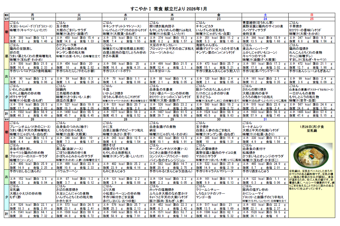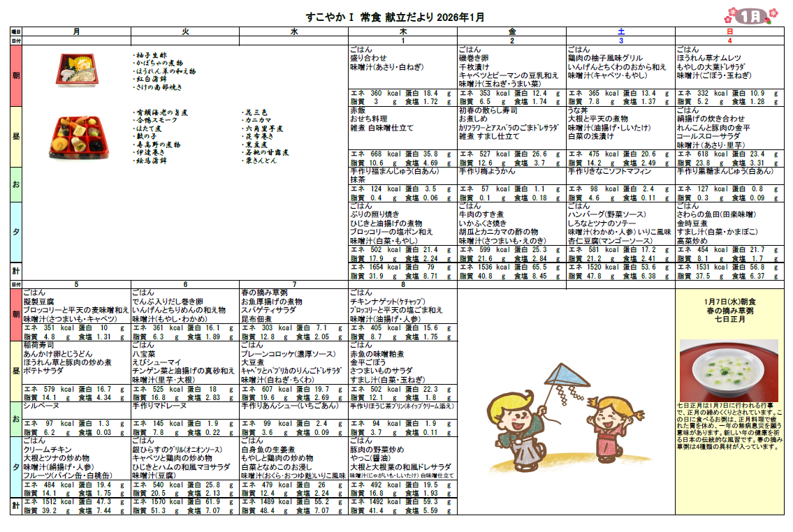 2025.12.26 お食事 1月の献立♬ Tweet シェアする 1月の献立をお伝えします☆彡 優っくり村下馬 杉原 前の記事 2025.12.29 お食事 【グループホームの雰囲気】日中のご様子☆彡 次の記事 2025.12.25 お食事 おやつのクリスマスケーキ 一覧へ戻る