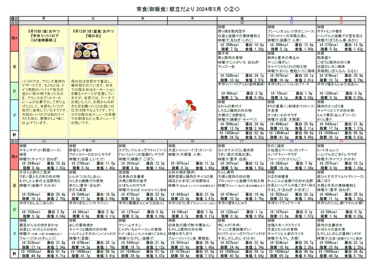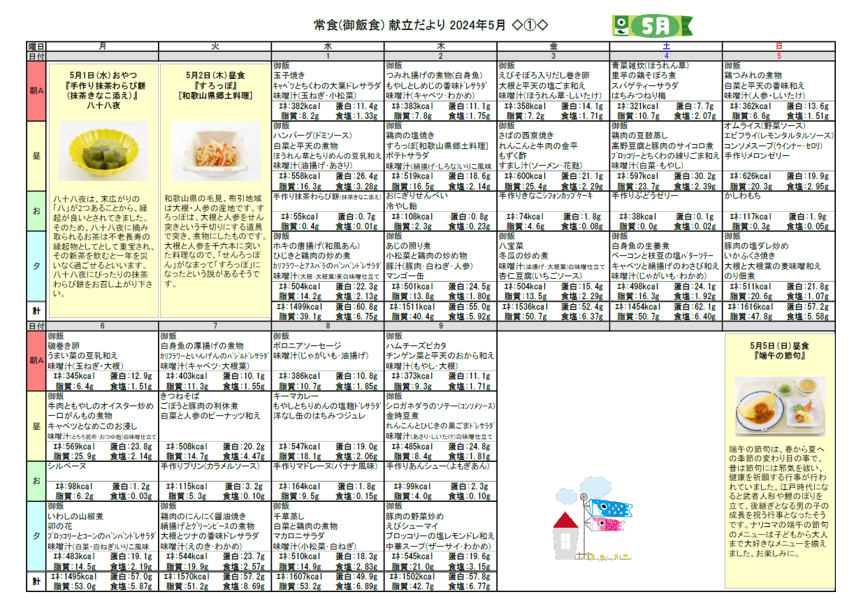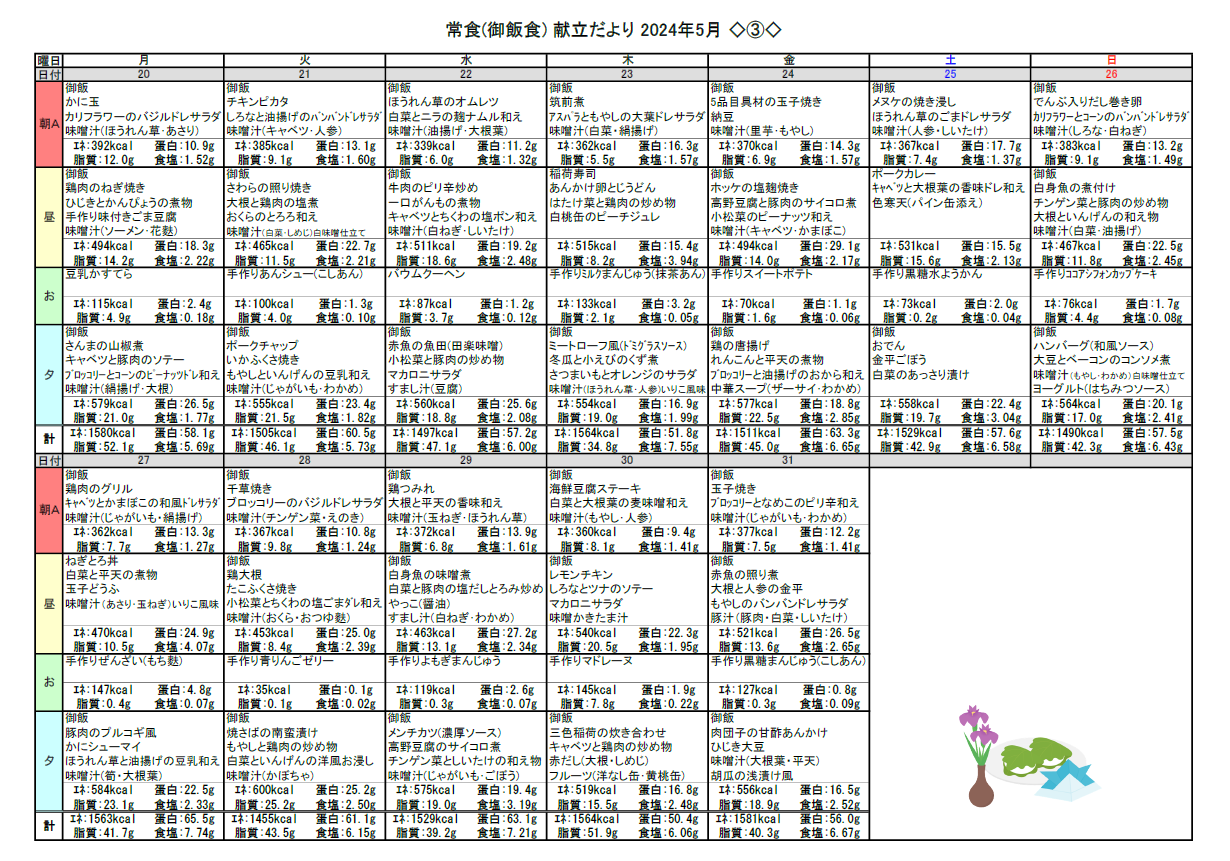 2024.04.29 お食事 5月献立表♬ Tweet シェアする こちらが5月の献立になります♪ 優っくり村下馬 杉原 前の記事 2024.05.02 お食事 いつもの体操🙋♀️🤸♂️ 次の記事 2024.04.28 お食事 朝の身だしなみチェック🤔 一覧へ戻る