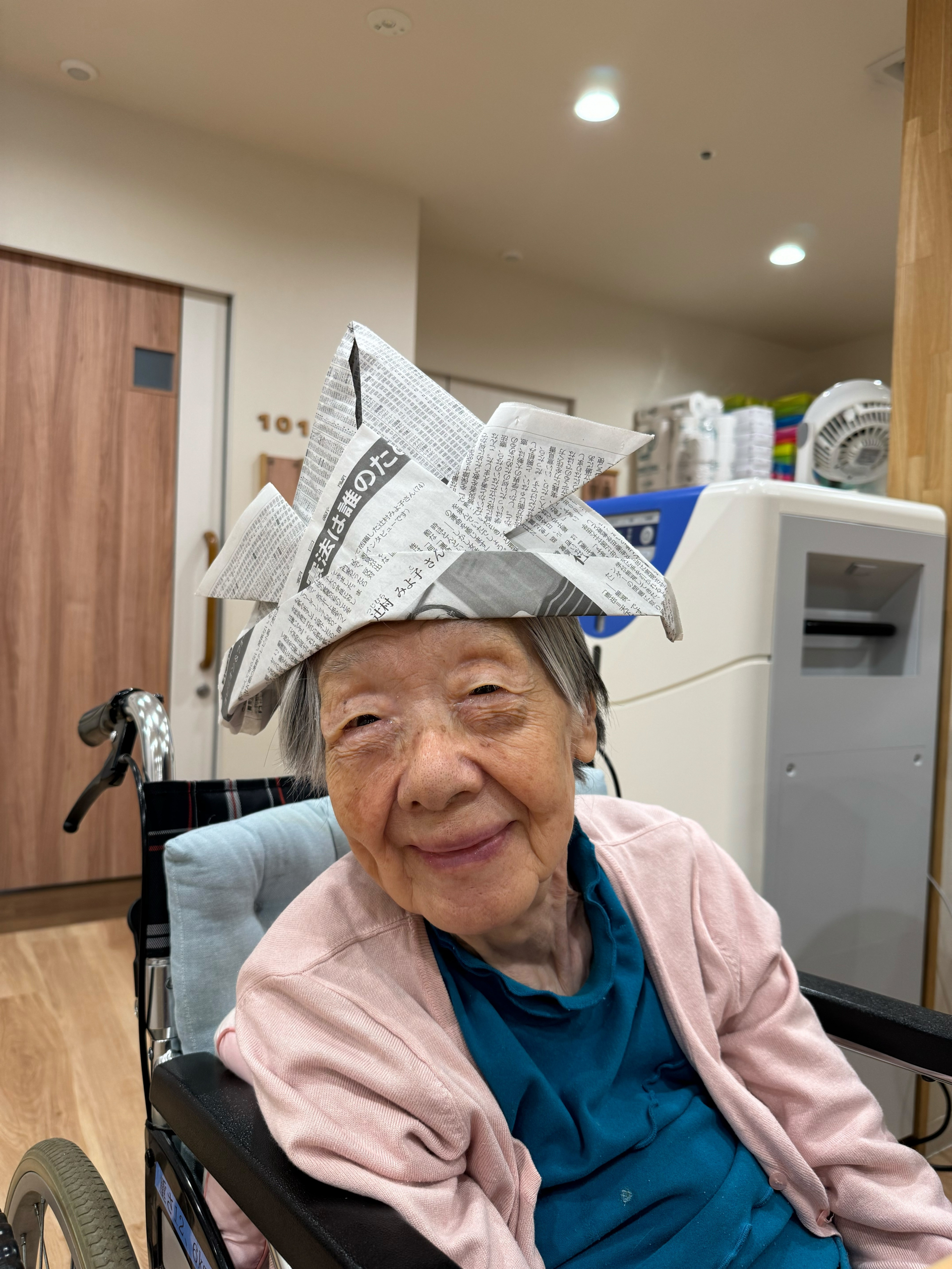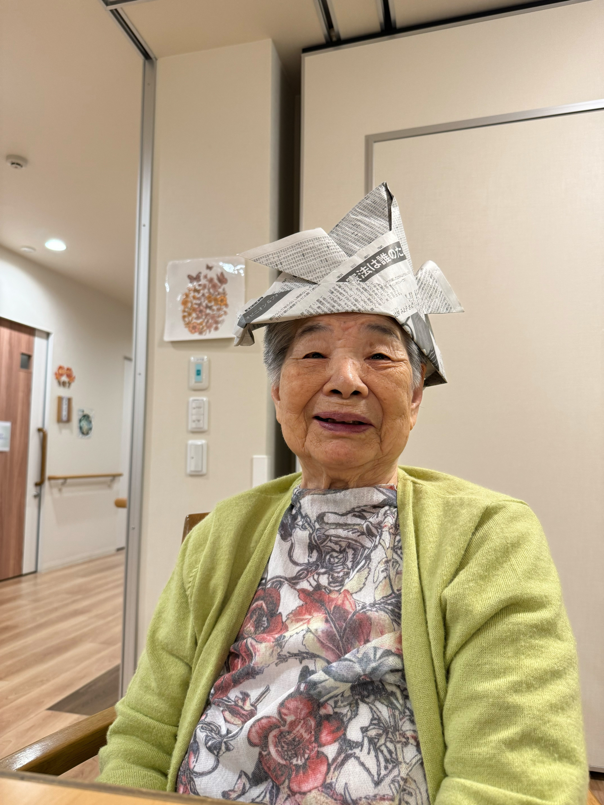 それから、昔を思い出しながら新聞紙で兜を折り、かぶってみました!
