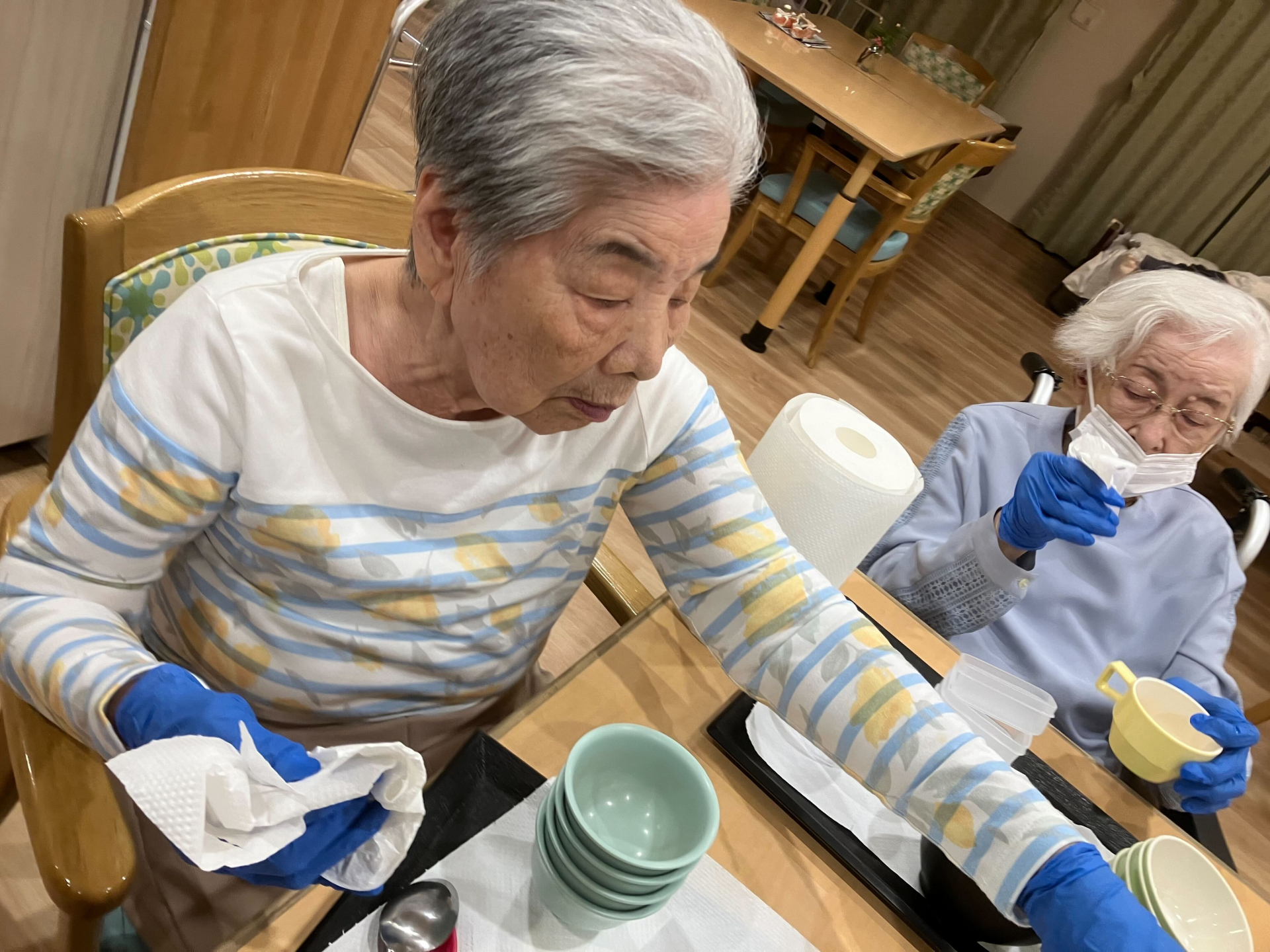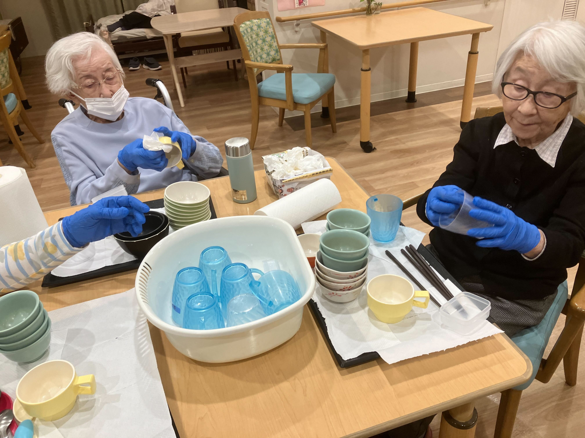実は!食器拭きは、腕を伸ばしたり指先を動かして細かな作業をしたりとリハビリの側面もあります\(^o^)/