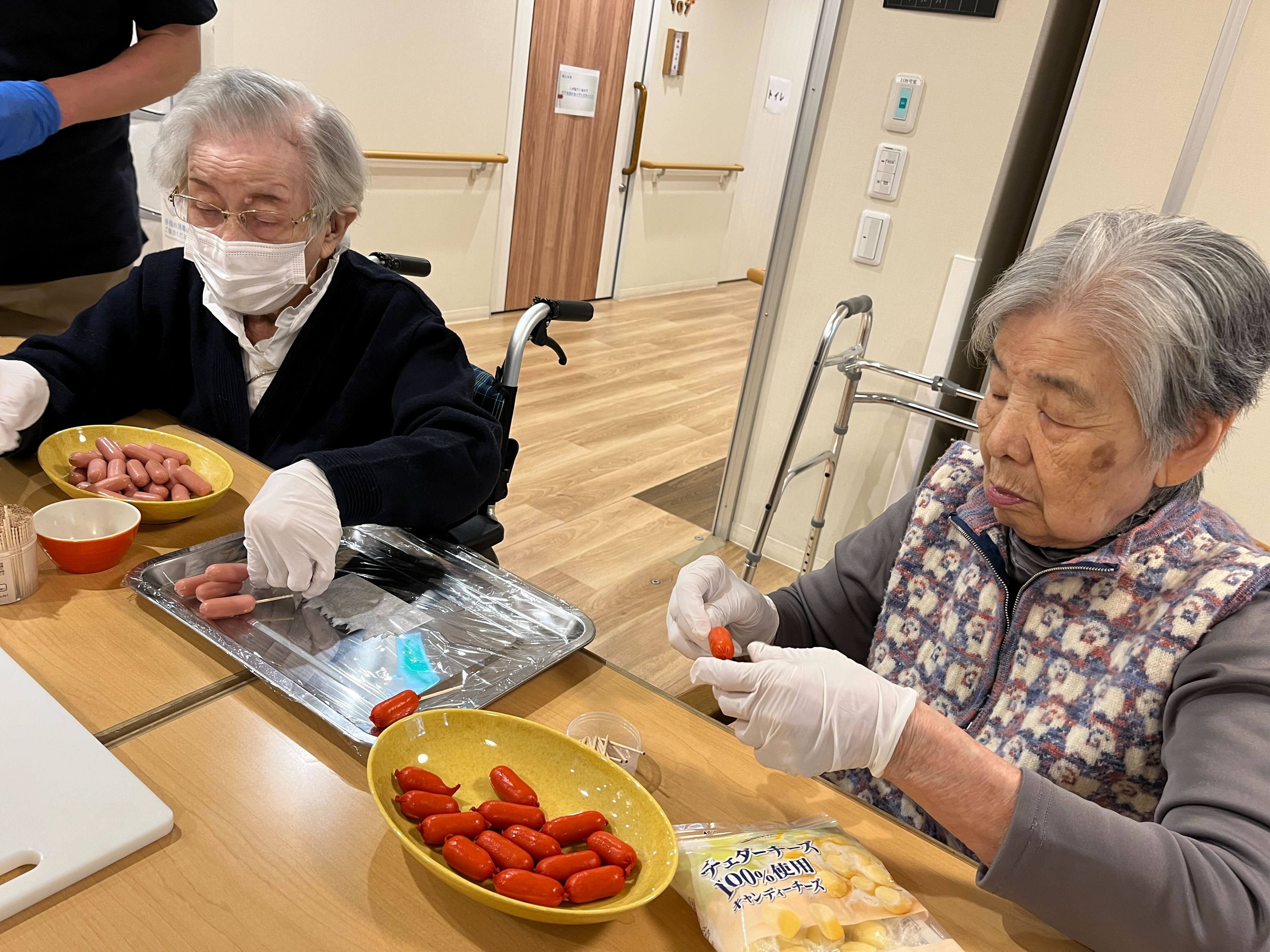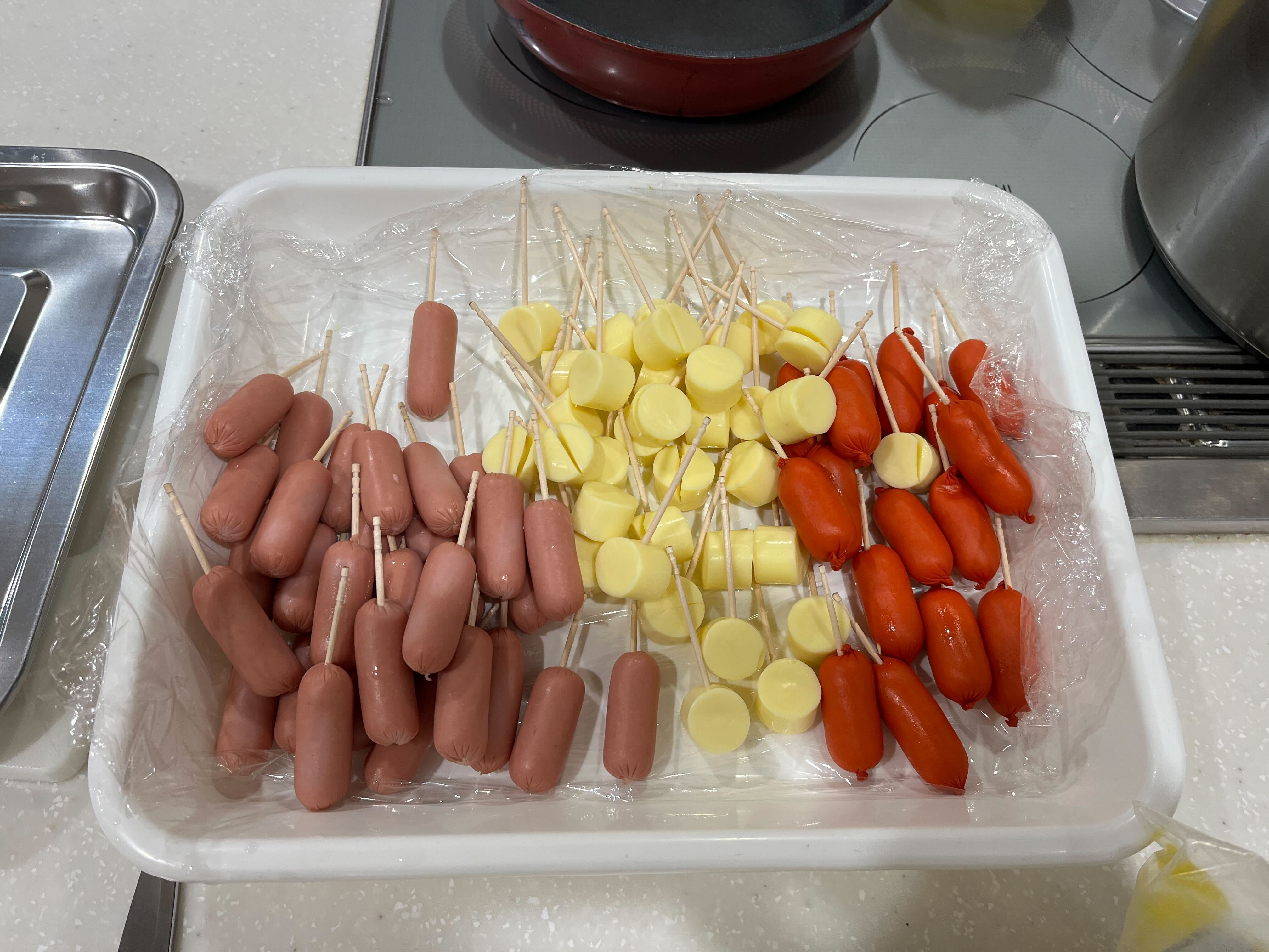 醍醐課長指導のもと、入念に串にウィンナーを刺していましたΣ(・ω・ノ)ノ!