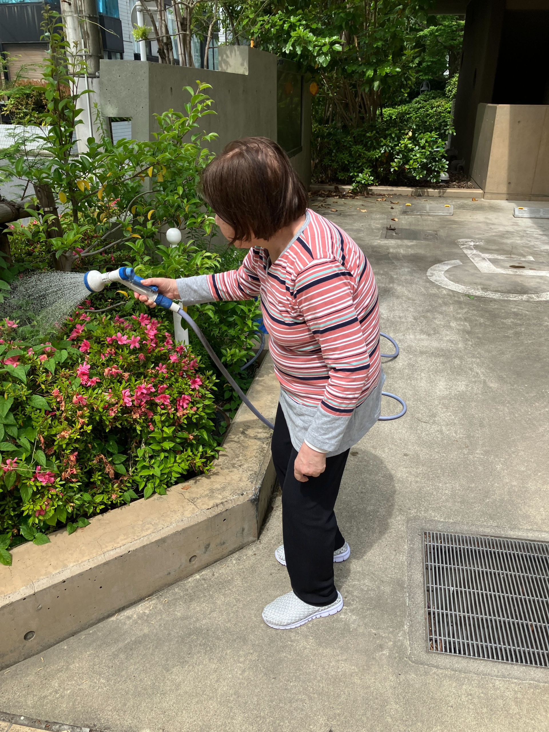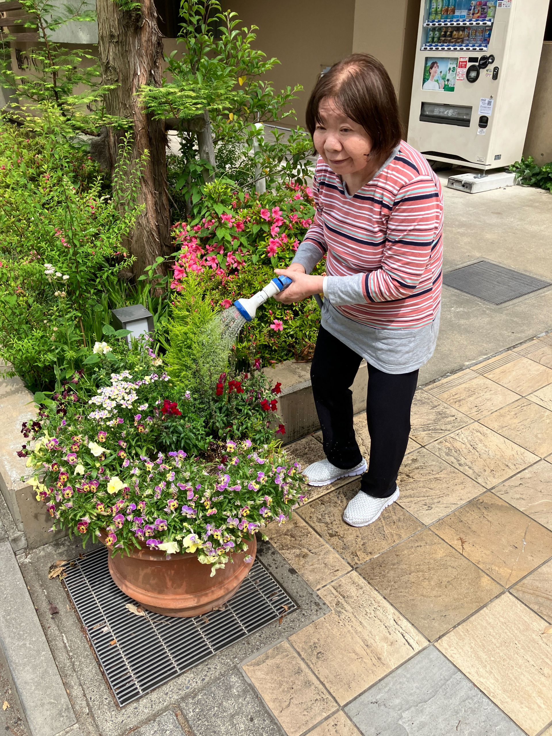 玄関先に咲いているお花の水やりを手伝っていただきました!